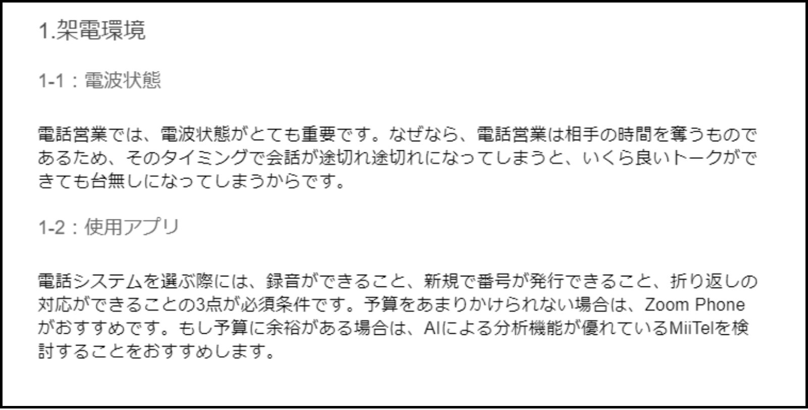 例えば、「架電に適した環境」では電話営業に向いているアプリの選び方やヘッドセットなど、電話営業を始める前に準備しておきたい項目から詳しく解説します。