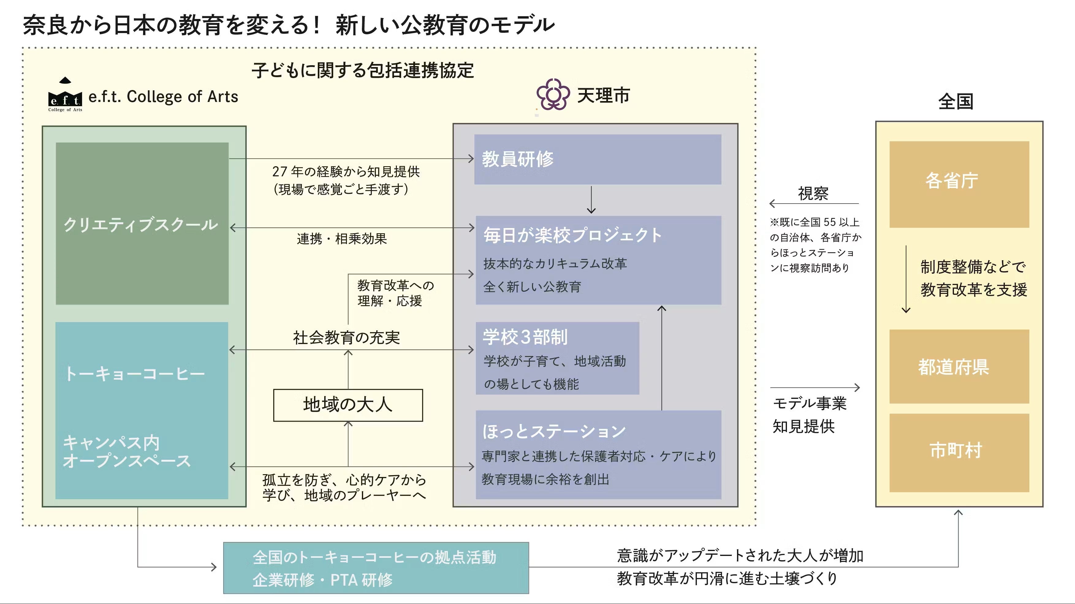 アトリエe.f.t.(代表:吉田田タカシ)は、2027年4月の開学を目指し、奈良県天理市に、子どもが主体的に学び、大人が価値観をアップデートできる新しい学校「e.f.t. College of Arts」の創設に取り組んでいます。天理市との正式な包括連携協定のもと、行政・民間・地域が三者協働でつくる“準公共性”を備えた教育拠点として、全国へ広げていくことを目指します。