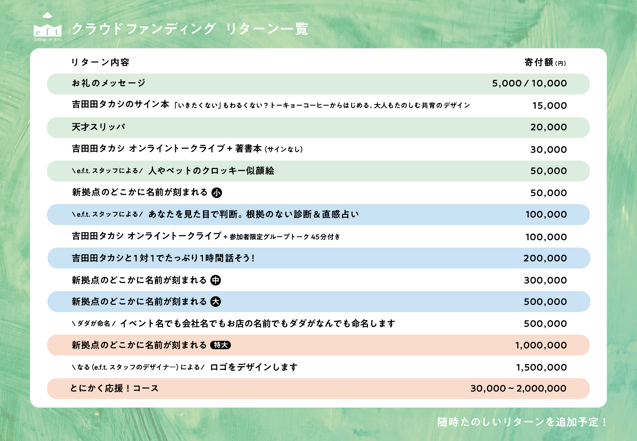 目的:2027年4月の開学に向けた「e.f.t. College of Arts」設立資金の一部を集める(総工費2億7,000万円のうち、残り2,000万円)