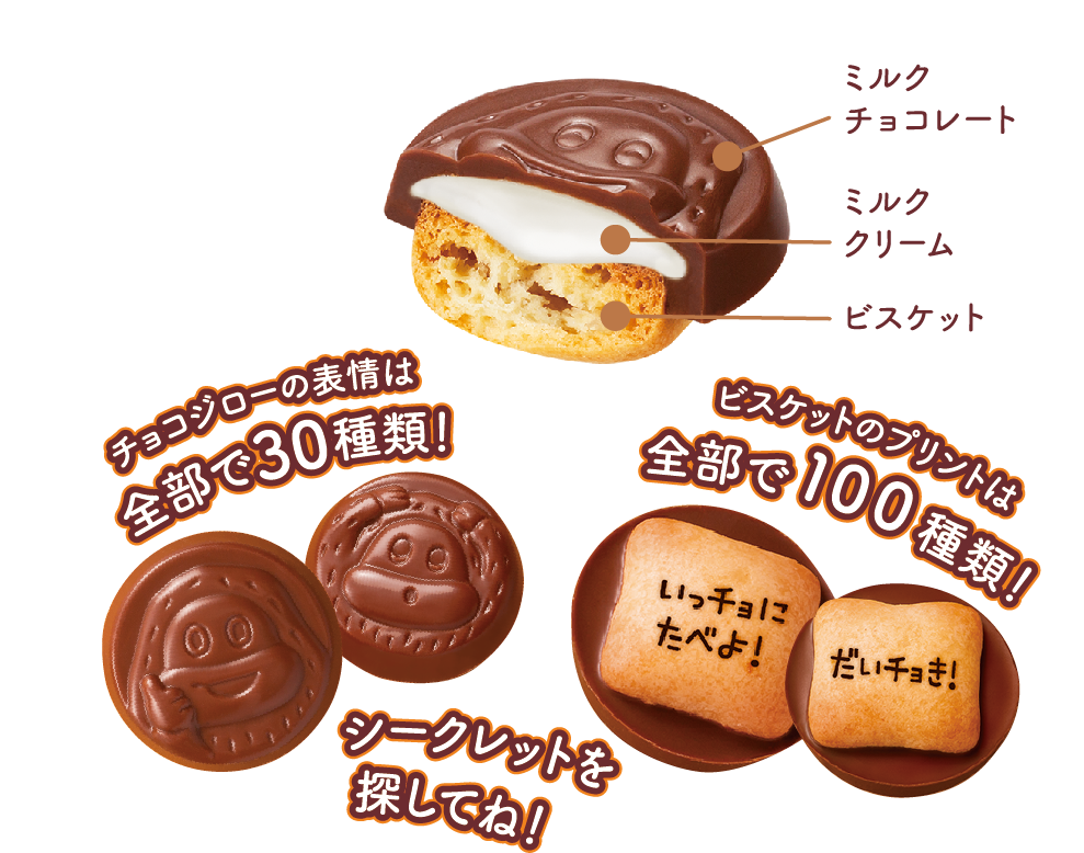 また、パッケージは全4種類でそれぞれにチョコジローと仲間たちのいろんな表情やポーズが描かれています。カラフルでポップなデザインが、おやつの楽しい時間を盛り上げます♪