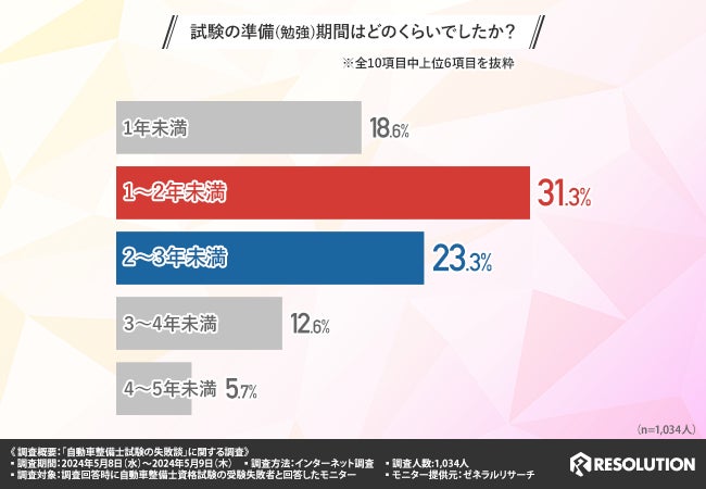 「試験の準備(勉強)期間はどのくらいでしたか?」と質問したところ、『1~2年未満(31.3%)』と回答した方が最も多く、次いで『2~3年未満(23.3%)』と続きました。