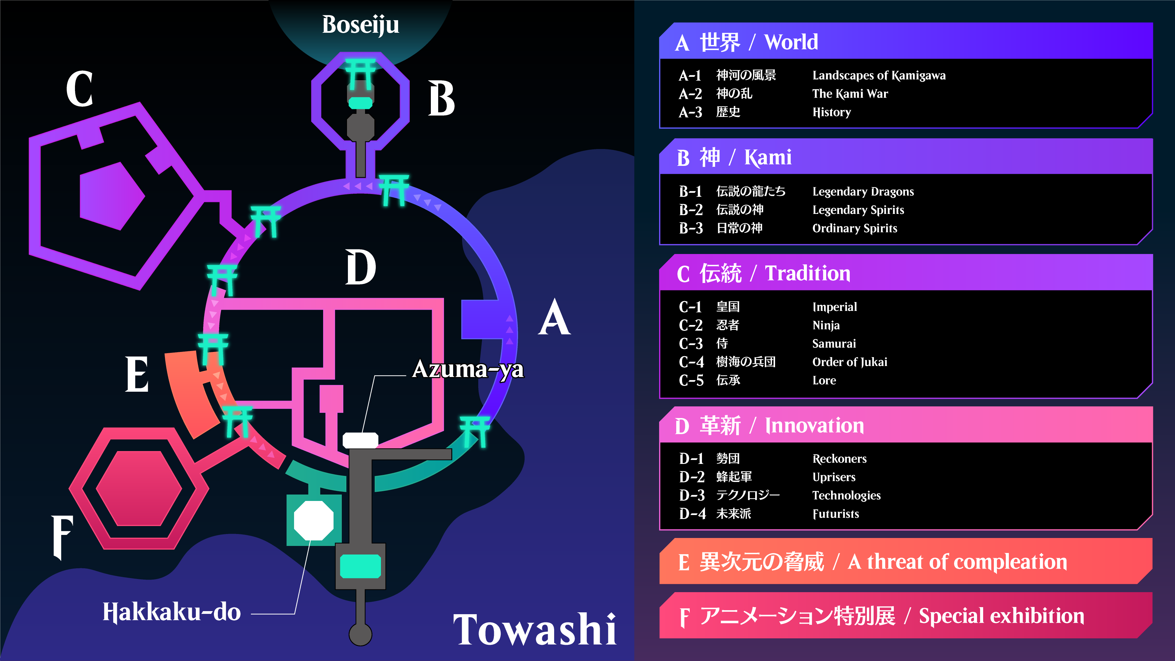 日本神話とテクノロジーが融合した1200年後の神河。 その舞台となる「都和市」や「母聖樹」のコンセプト アートの中に降り立ち、都市空間に縦横無尽に拡がるアート展を楽しめます。