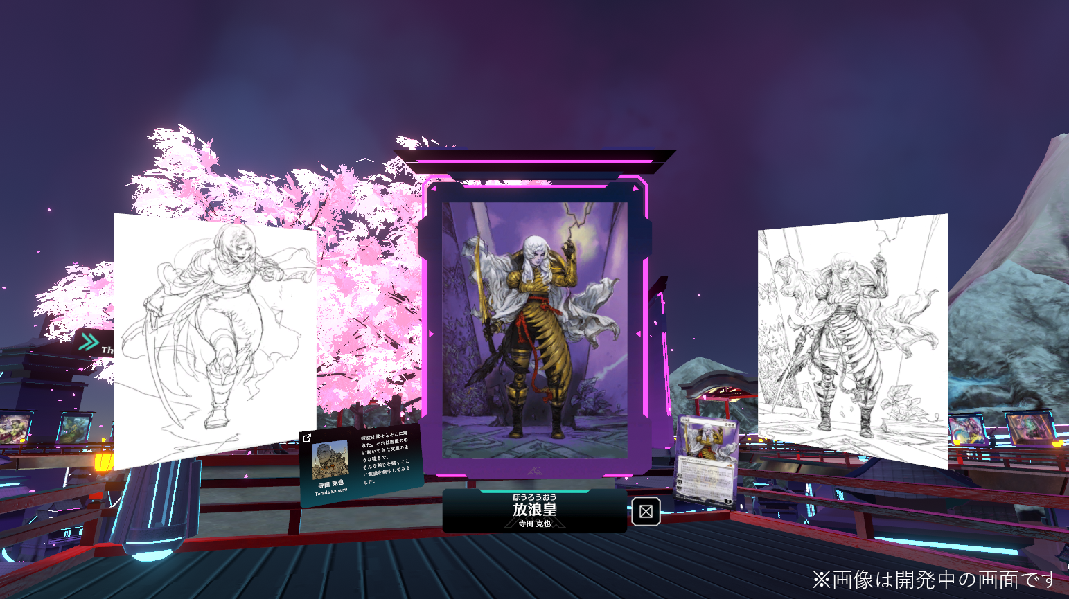 カードアートを引くと、神河の世界を背景に目の前にカードアートが大きく広がるだけでなく、その左右には下絵が広がり、右下にはカードが、そして左下にはアーティストのプロフィールが出現します。VRモードではカードを持って様々な角度から鑑賞することも可能です。一方向だけではない、五感を刺激するようなイマーシブで複合的な体験を可能としています。