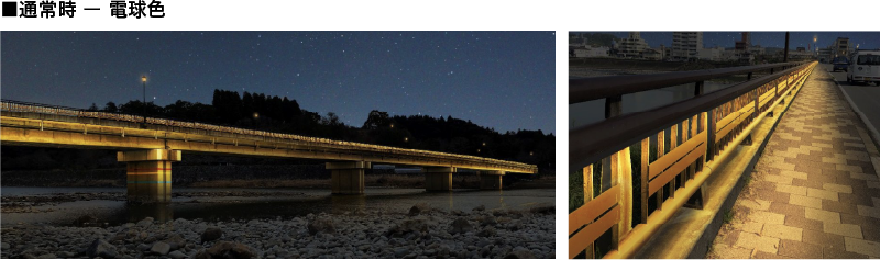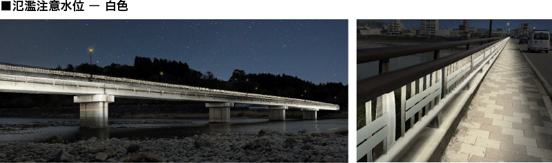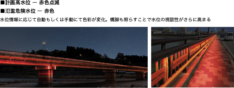 橋梁の手すりなどに水位センサーと連動した変色可能なLED照明を設置し、水位センサーにより基準水位(※暫定)に達した場合に照明の色が自動で変化する事で住民へ危険を伝える事が可能になりました。