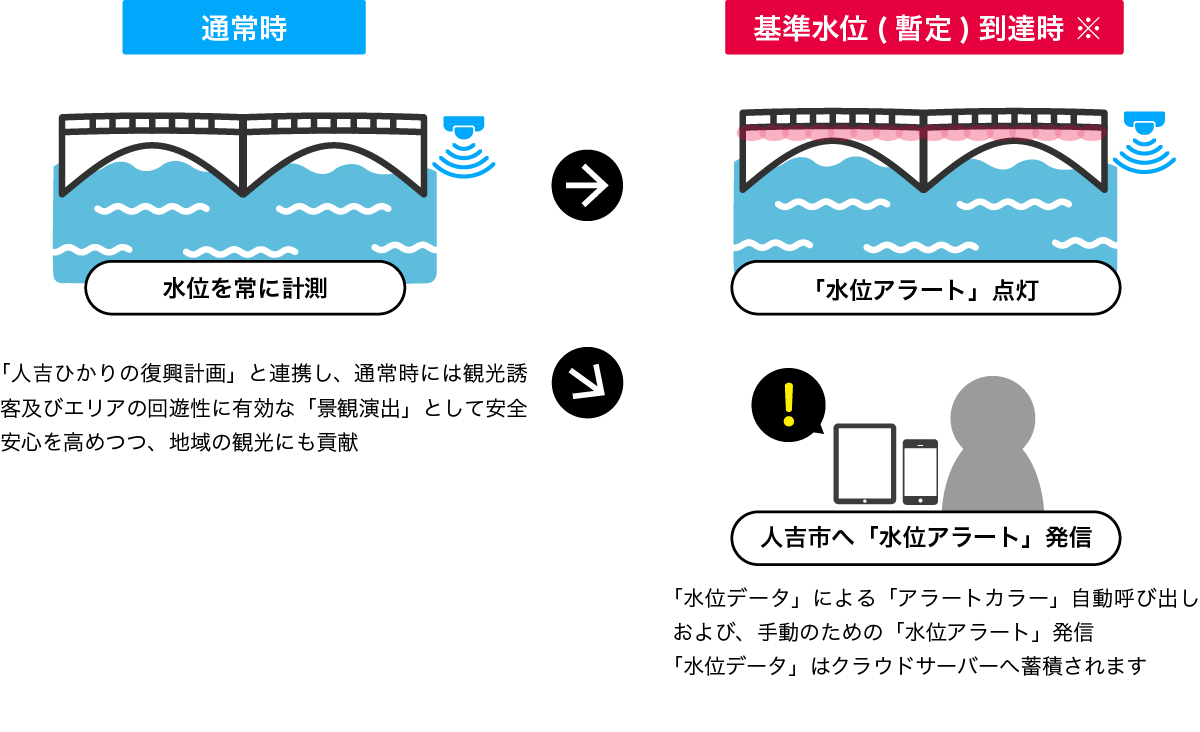 日本初!IoTを活用した橋への照明効果による水位アラート「人吉市ライティング防災アラートシステム」の運用が開始されました