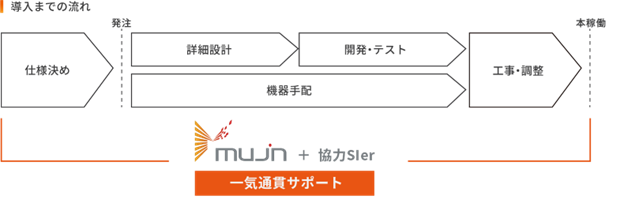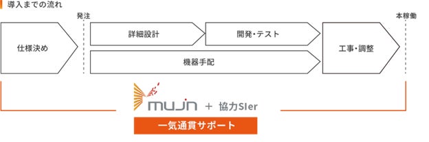 そこでMujinは、構内物流自動化の需要拡大に対応可能な製品・部品在庫供給体制と、経験豊富な専門チームがお客様の構想を実現するために的確な仕様提案を行い、加えてSCREEN様のご協力もあり、ご成約からシステム立ち上げまで、平均的な導入期間に比べ(当社比)スピーディーな導入を可能にしました。