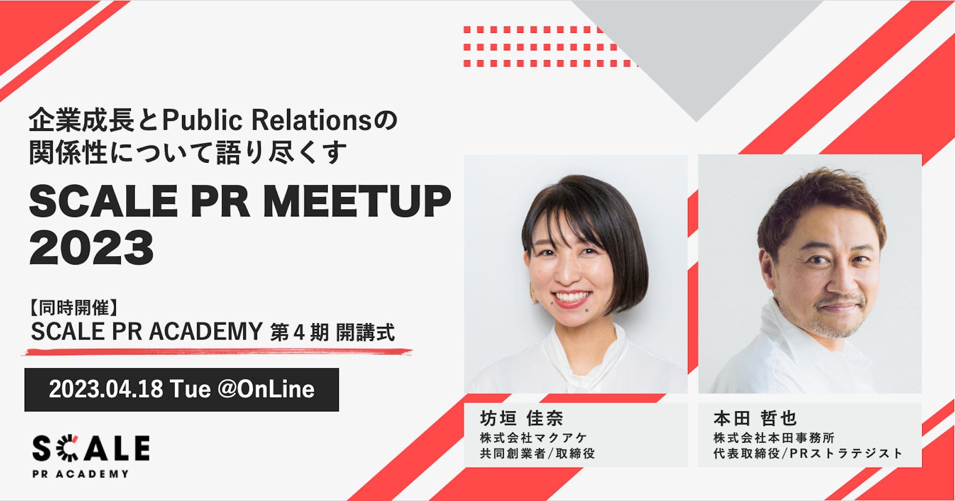 株式会社本田事務所(所在地:東京都港区、代表取締役:本田 哲也)と、株式会社ベクトル(所在地:東京都港区、代表取締役会長兼社長:西江 肇司)が共同で運営する成長型PR人材データベース「SCALE Powered by PR」(以降 SCALE)は、一流講師陣による広報アカデミー「SCALE PR ACADEMY」の第4期を2023年4月18日(火)より開講します。