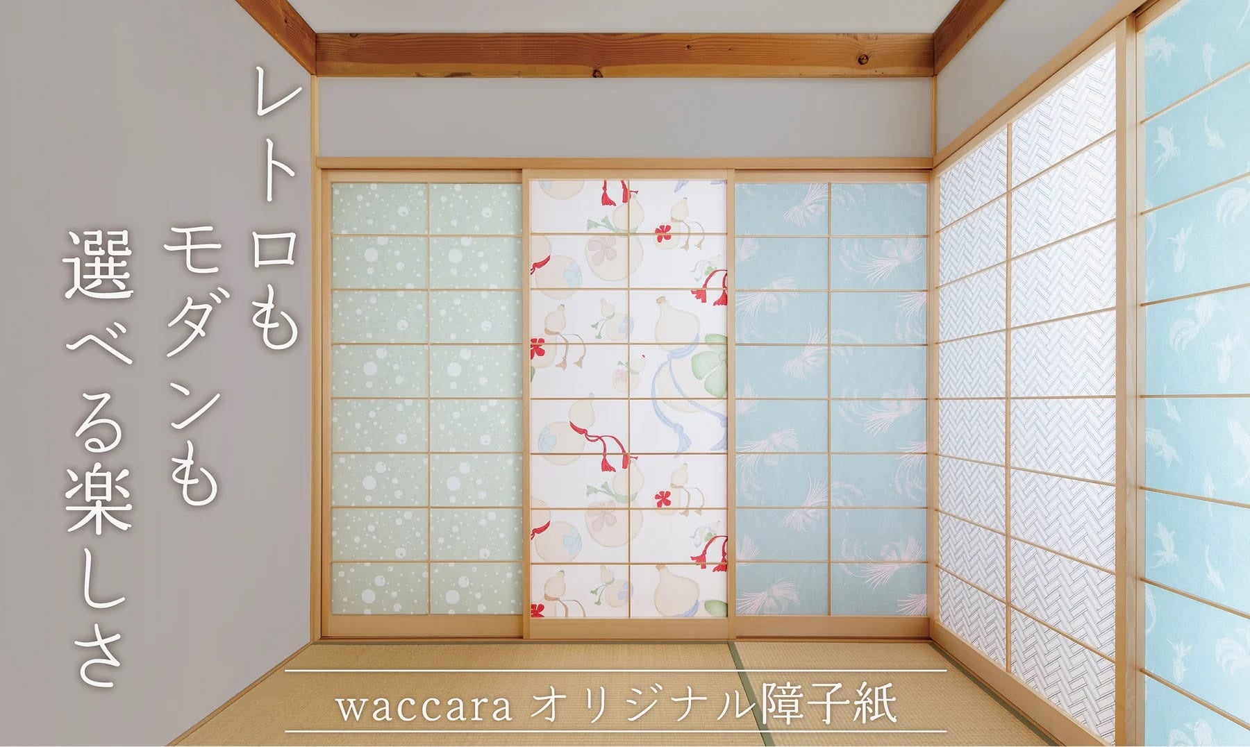 waccaraのデザイン障子紙は、和室をやさしく彩るオリジナルパターンを多数展開。やわらかな光を通しながら、お部屋の雰囲気をぐっと明るく華やかに仕上げます。