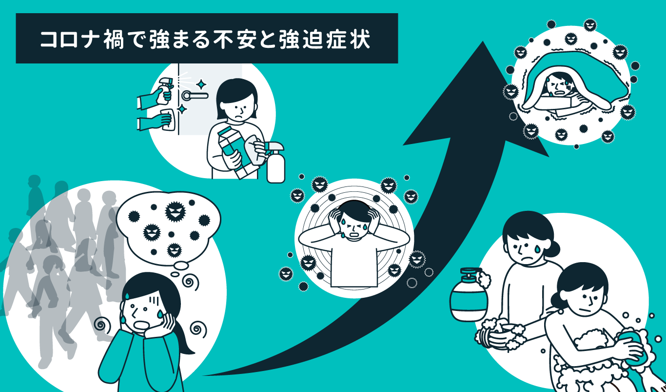 強迫症はきわめて強い不安感や不快感(強迫観念)をもち、それを打ち消すための行為(強迫行為)を主な症状とする精神疾患であり、有病率は一般人口で2-3%と言われています。 よくある不潔恐怖・洗浄強迫の症状の例として「菌がついていないか。病気に感染するのではないか。」という不安感から、過剰に手洗いや除菌、入浴を行うというような行為を繰り返すなどの症状があります。