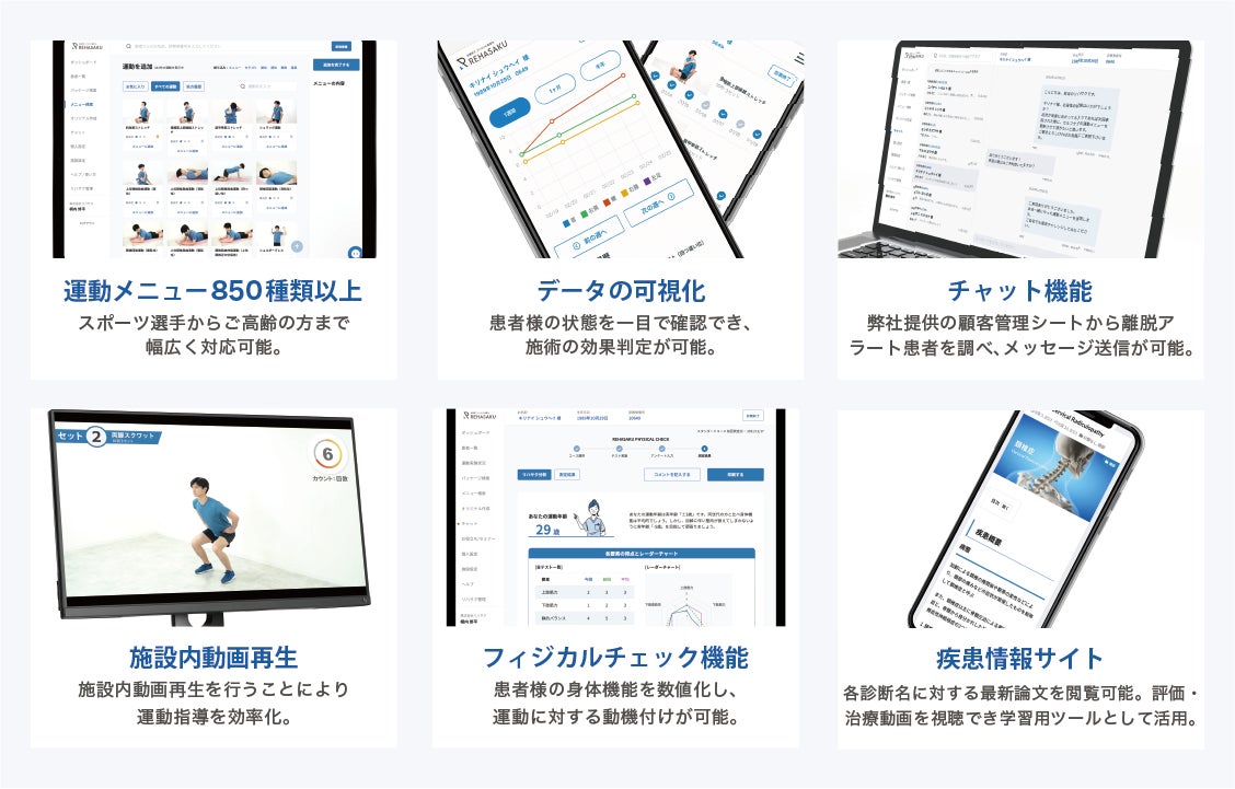 リハサクはセラピストが運動指導を起点に患者のセルフエクササイズまで介入し、その結果を評価するサイクルを実現できるプロダクトです。850種類以上の運動メニューから患者様に適した運動メニューを動画で提供でき、セラピストの運動指導業務の効率化・患者様のセルフエクササイズの継続率向上に寄与します。