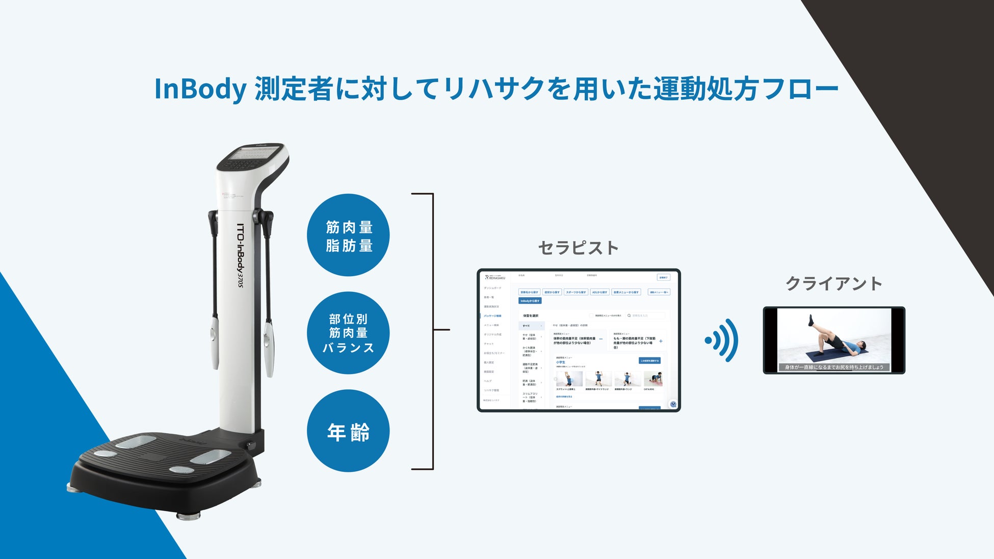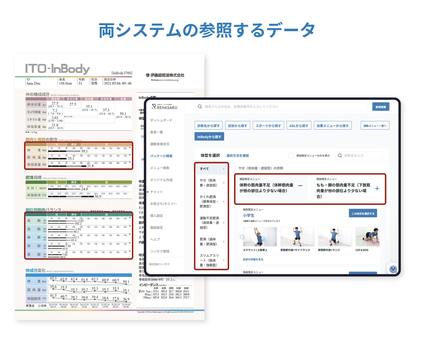 接骨院・整骨院向けに運動療法クラウドシステムを展開している株式会社リハサク(以下リハサク)では、伊藤超短波株式会社が提供するITO-InBody測定後の対象者に対し、リハサクシステムを用いて運動療法の提供が可能となりました。