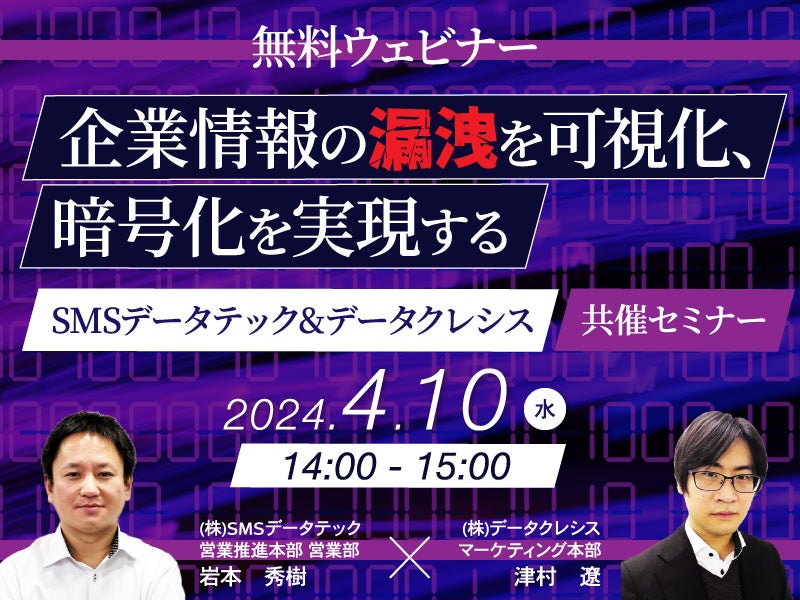 株式会社データクレシス(東京都千代田区、代表取締役 曽我祐二郎、以下データクレシス)は、株式会社SMSデータテック(本社:東京都中央区、代表取締役社長:松原 哲朗、以下SMSデータテック)との共催にて、2024年4月10日(水)に無料オンラインセミナー「企業情報の漏洩を可視化、暗号化を実現する」を開催いたします。