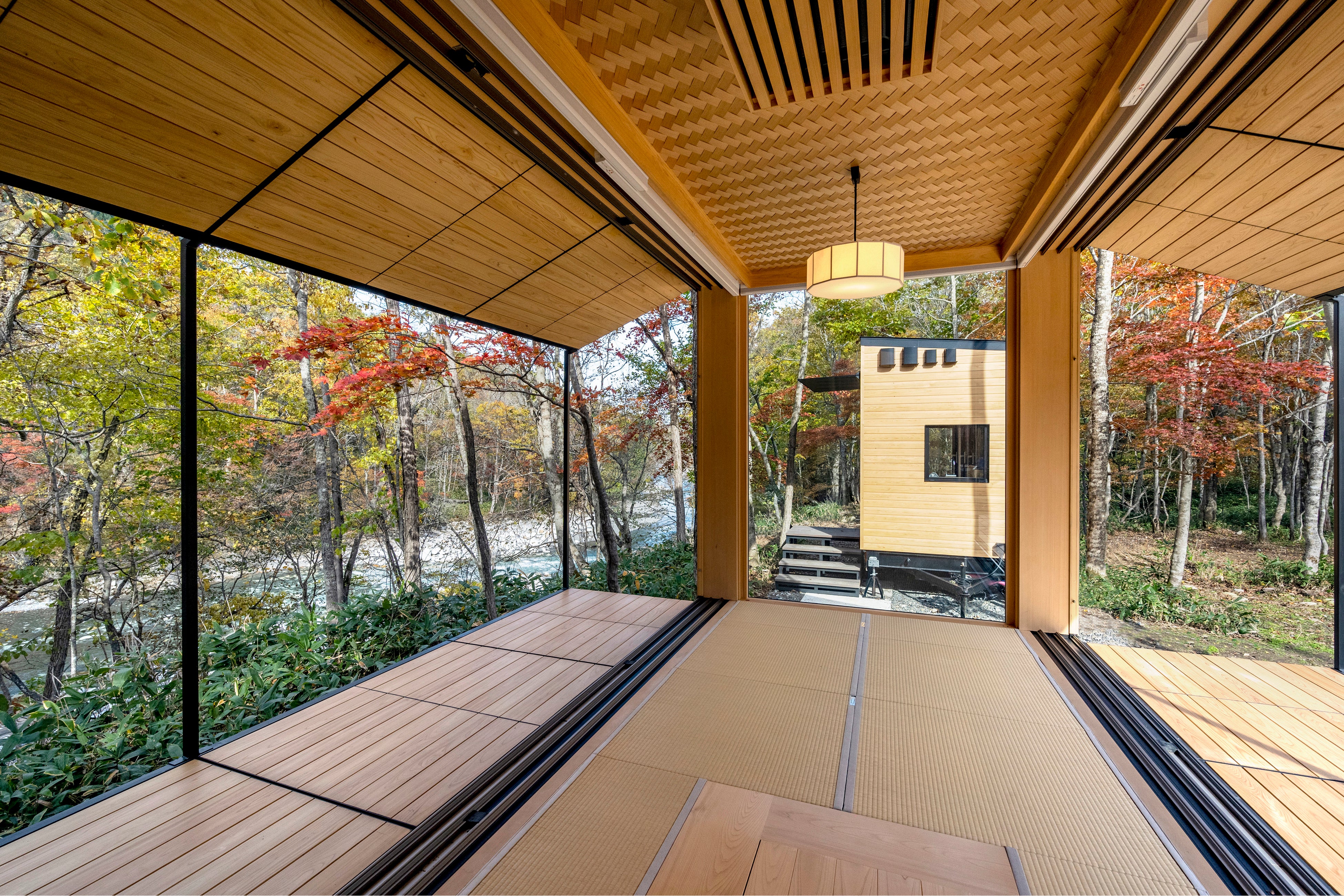 また和室ダイニングトレーラーは、まさに食事をするためだけに作られた贅沢なつくりで、畳が敷かれた小上がりの中心に囲炉裏がついたテーブルが設置され、障子が設置された三方の窓からは四季折々の自然の景色を見渡すことができます。