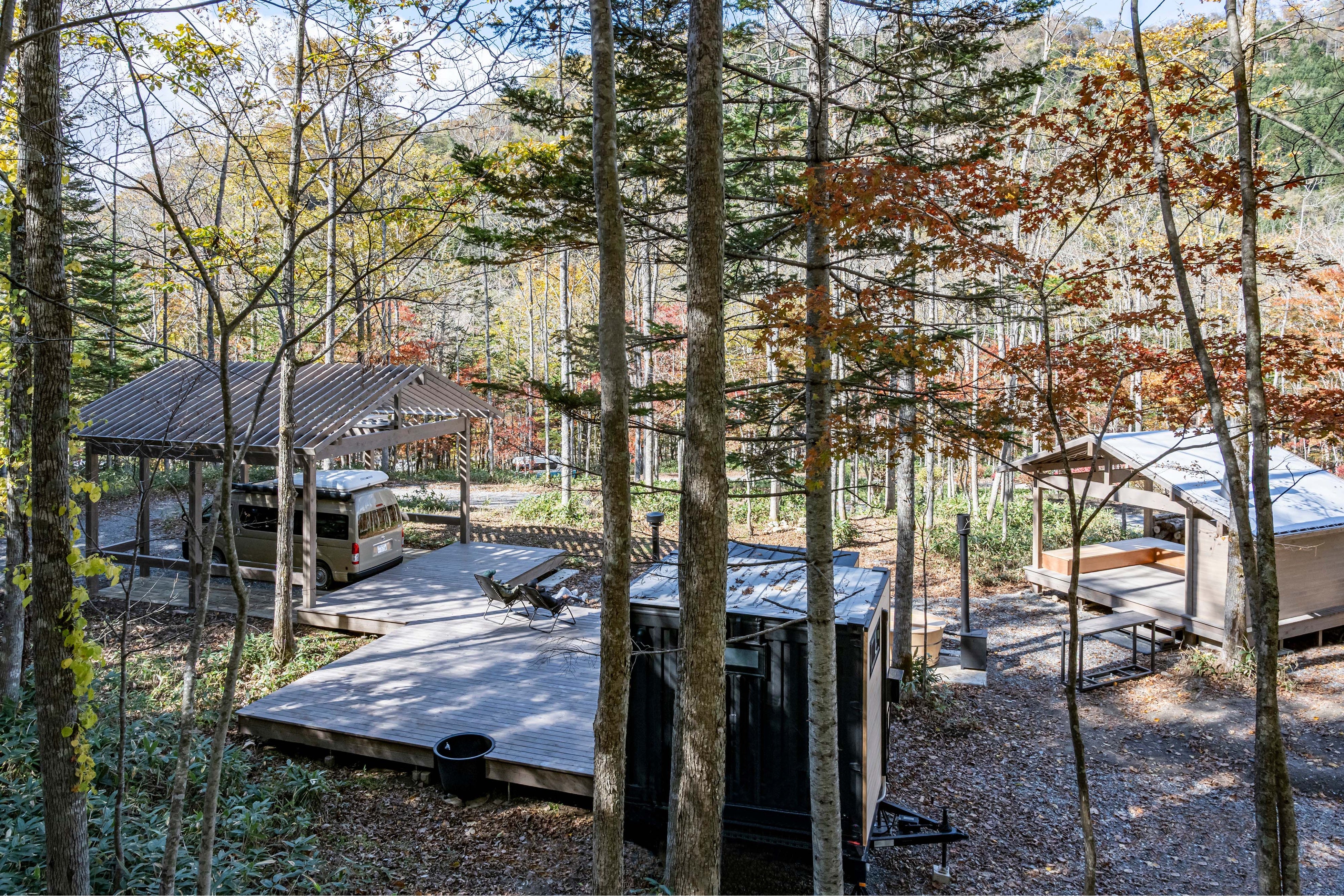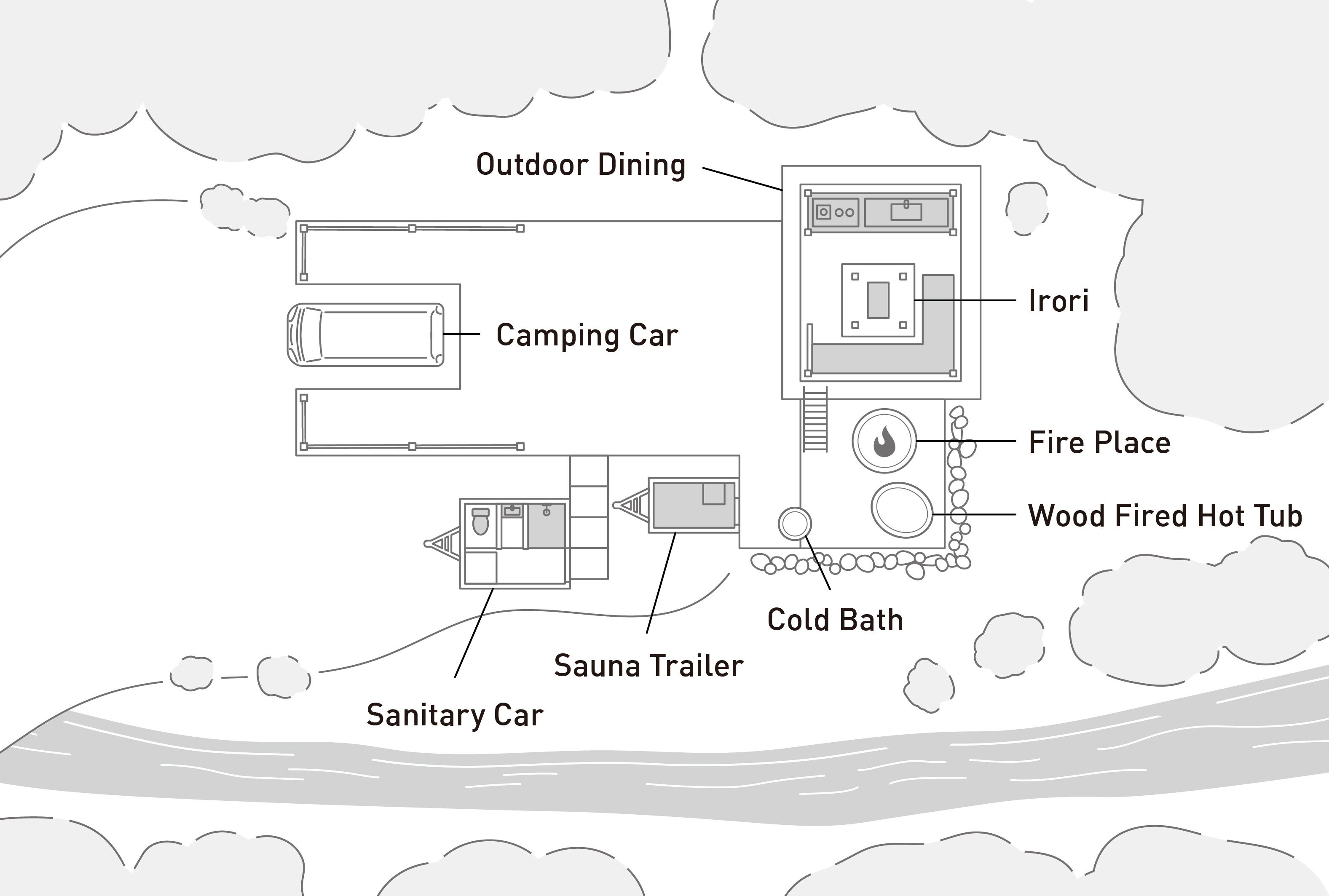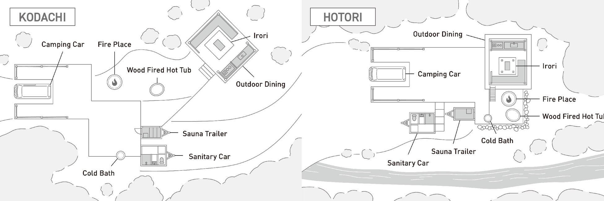 キャンピングカーの停泊地(=デッキ)に、ホテルクオリティのキャンピングカーを接続させることによって完成する、2つのネイチャースイートサイト。サイト名はそれぞれのロケーションに由来し、木立に囲まれている「KODACHI」と、川の畔にある「HOTORI」と名付けられました。サイト内には他に、レンタカーを接続するためのデッキ、アウトドアキッチンデッキ、露天風呂、サウナトレーラー、サニタリートレーラーが隣接しています。