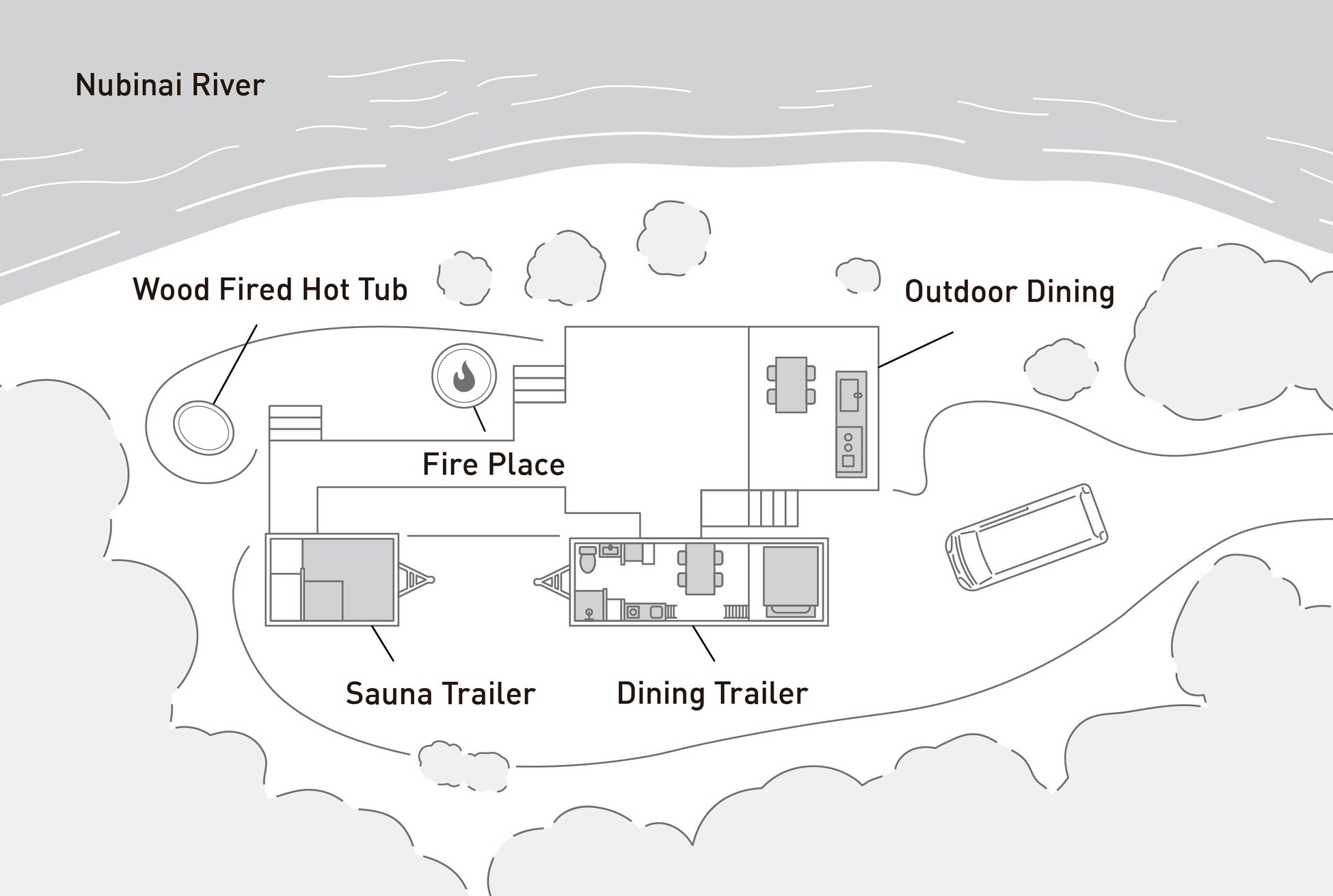 ・サイト構成:客室トレーラー(和室)、ダイニングトレーラー、薪式露天風呂、サウナトレーラー(水風呂付き)、ファイヤープレイス、パーゴラ