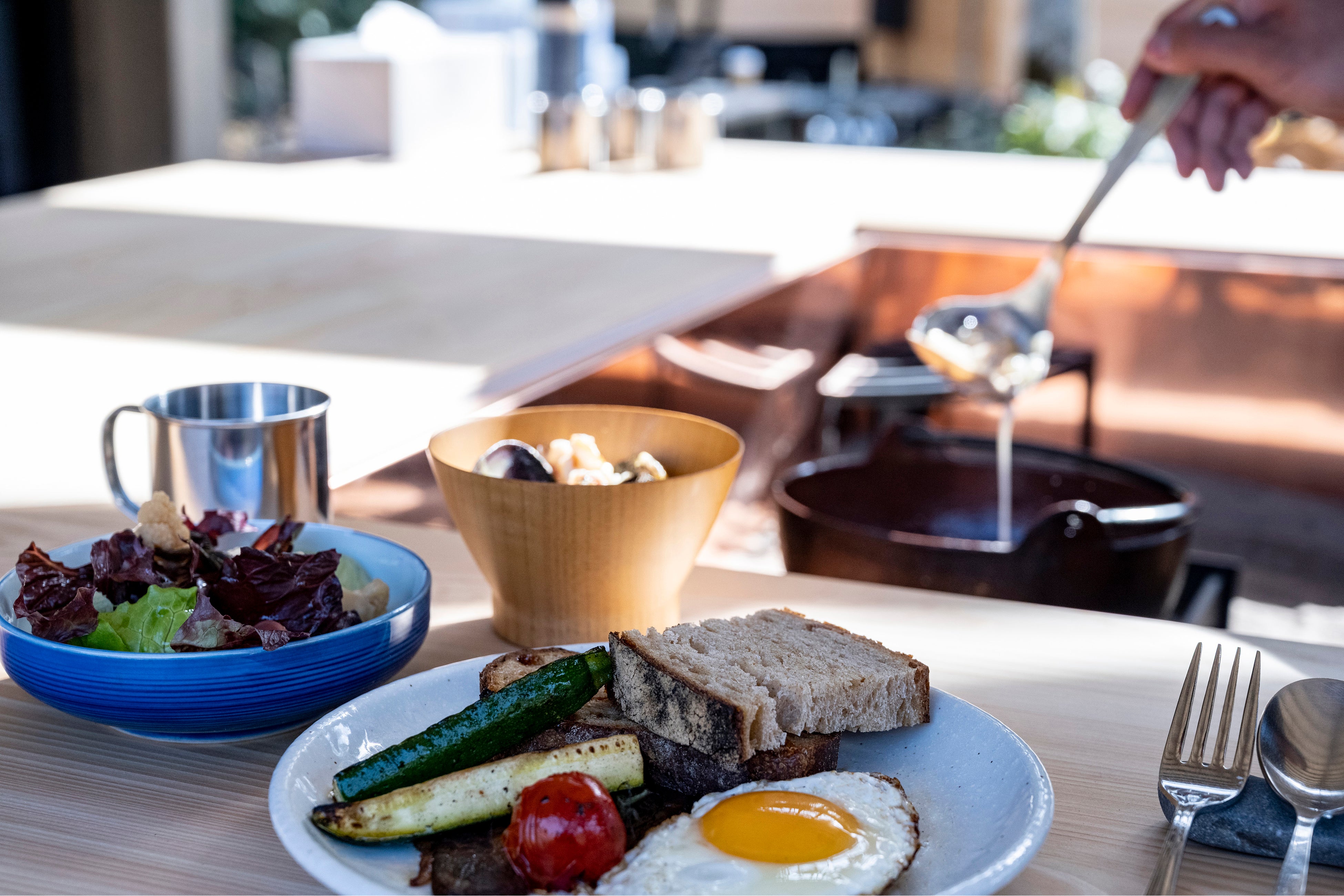 牛ベーコンのグリル、十勝・広尾産シーフードのクラムチャウダー、地元野菜のグリーンサラダ、パン