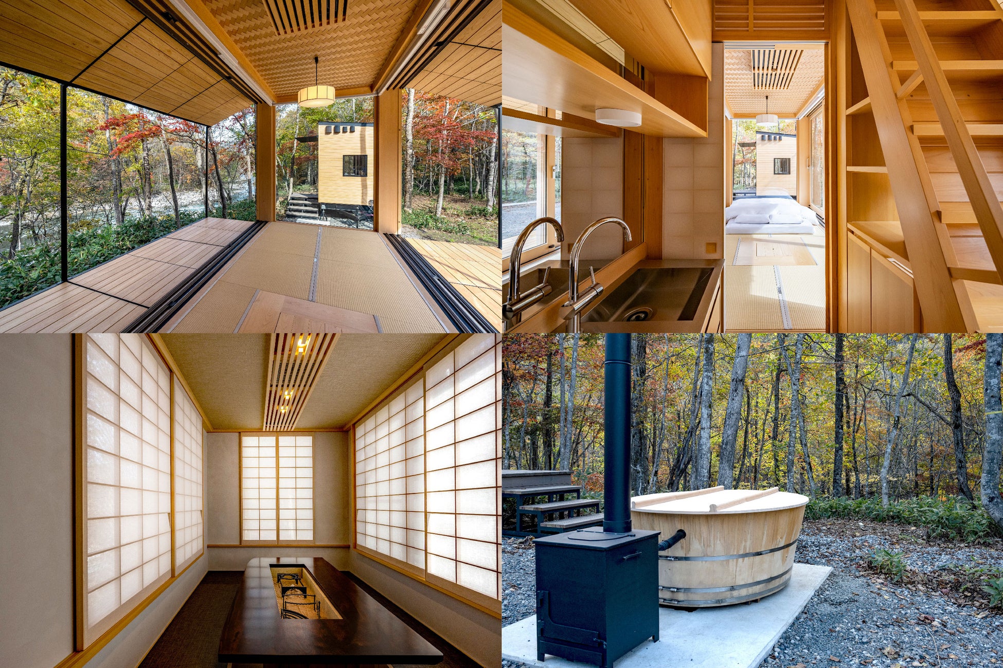 Moving Inn Tokachi 北の森の象徴とも言える、一般的な客室の機能を完備した和室トレーラーハウスは、六角屋 三浦史朗氏がデザインを監修。日本古来の座敷文化に見る暮らしの原点に立ち返った内装デザインをコンセプトとし、森の中で畳に横たわるくつろぎの時間を演出します。区画にはそれぞれのサイトの特徴に合わせ、囲炉裏付きダイニングトレーラーや水風呂完備の薪式サウナトレーラー、桶職人によって槙(まき)材で作られた薪式露天風呂、シャワー・トイレ用のサニタリートレーラーなどが配備されています。深い森の中で手付かずの自然との共生を実現しながら、快適な宿泊をご用意。Moving Innが目指す、原始的な自然体験(=”贅沢な旅”) を提案します。