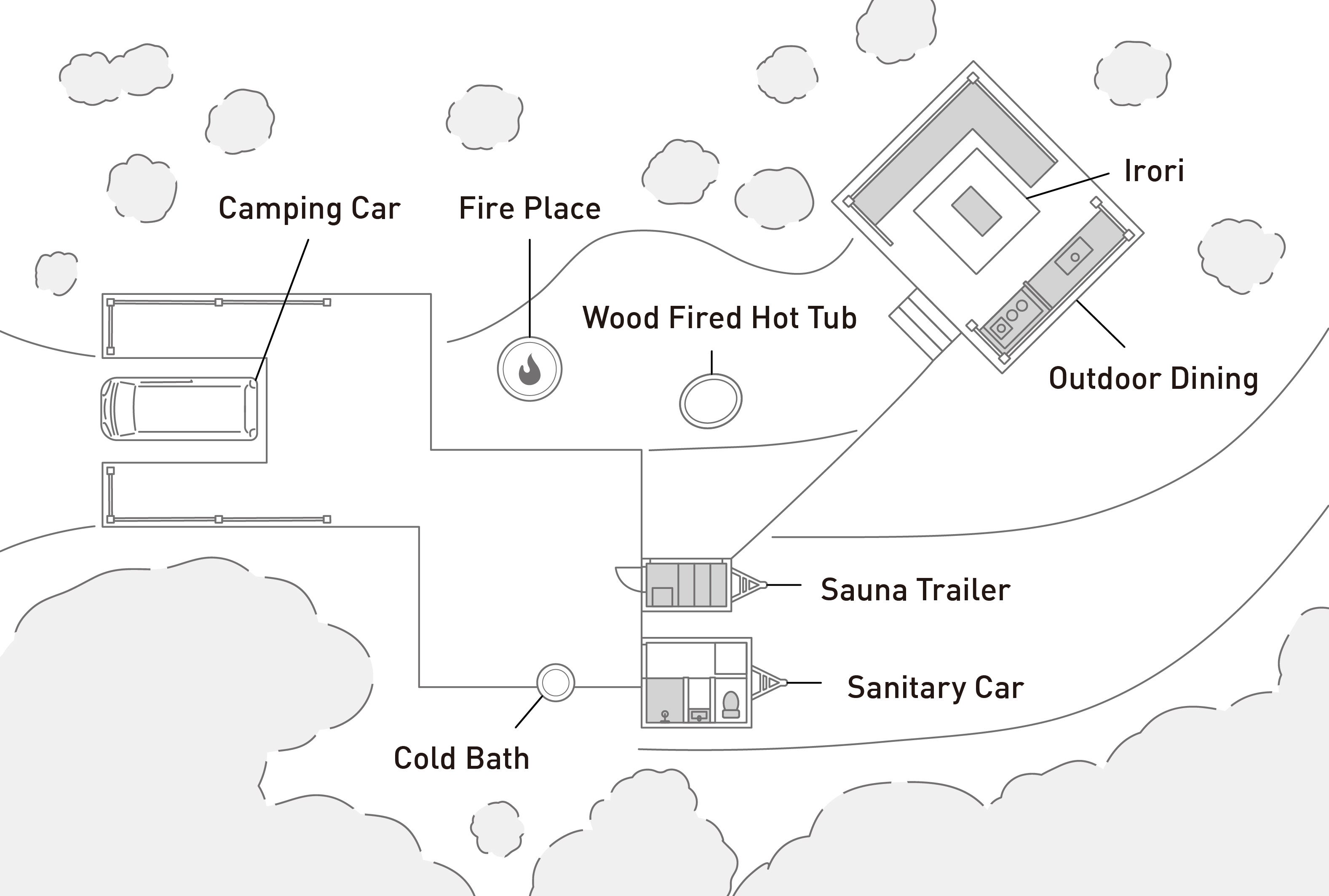 ・サイト構成: レンタカーコネクトデッキ、アウトドアキッチンデッキ、露天風呂、サウナトレーラー、ファイヤープレイス、サニタリートレーラー