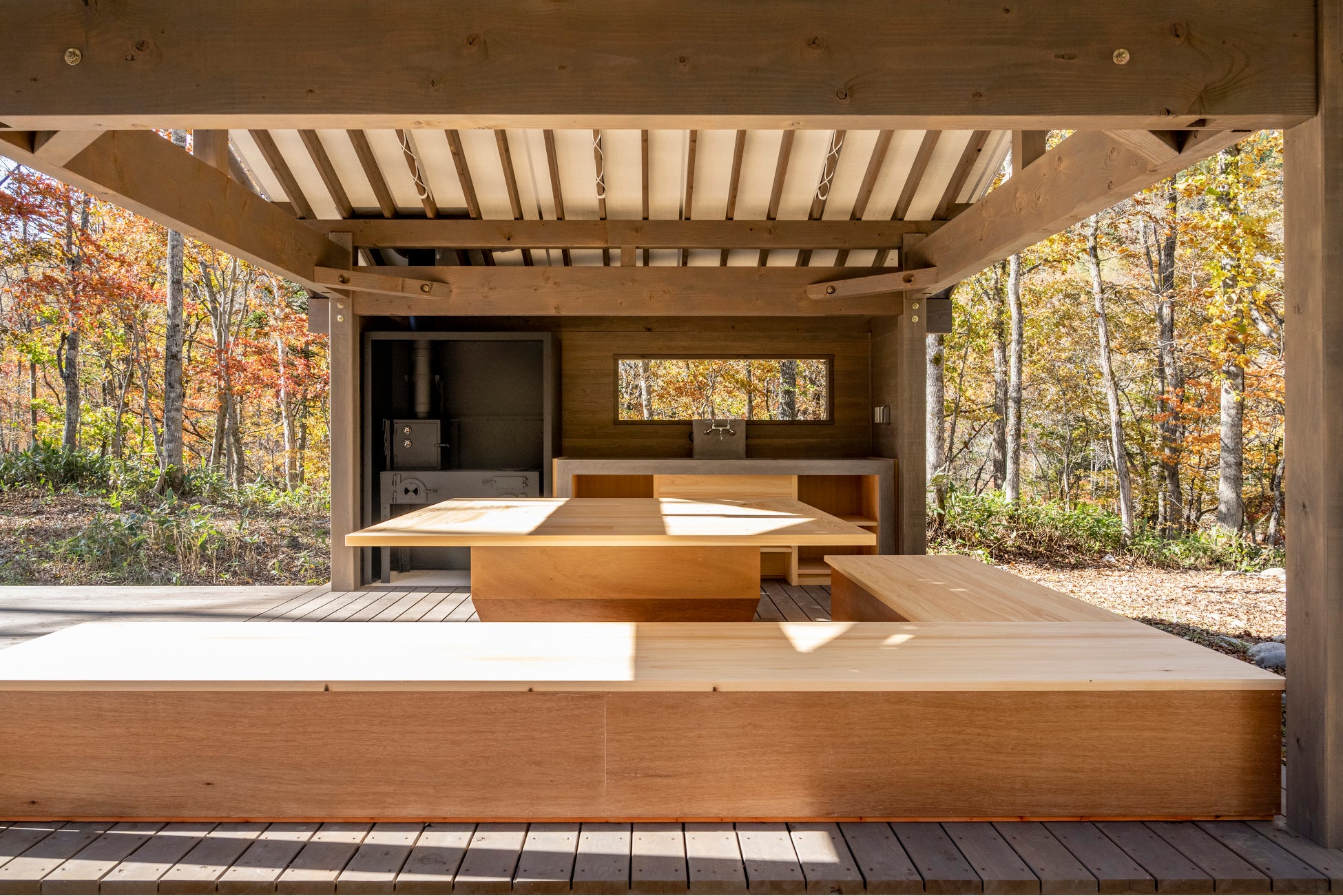 北海道有数の清流であるヌビナイ川を見下ろす形に設置されたダイニングデッキ。デッキで過している間は常に目と耳でその存在を感じることができます。デッキの中央には囲炉裏が設置され、その上にはアイヌ作家が製作した鍋をかける自在鉤がシンボリックに吊り下がり、外で囲炉裏を使った焼き物や鍋料理を楽しむことができます。