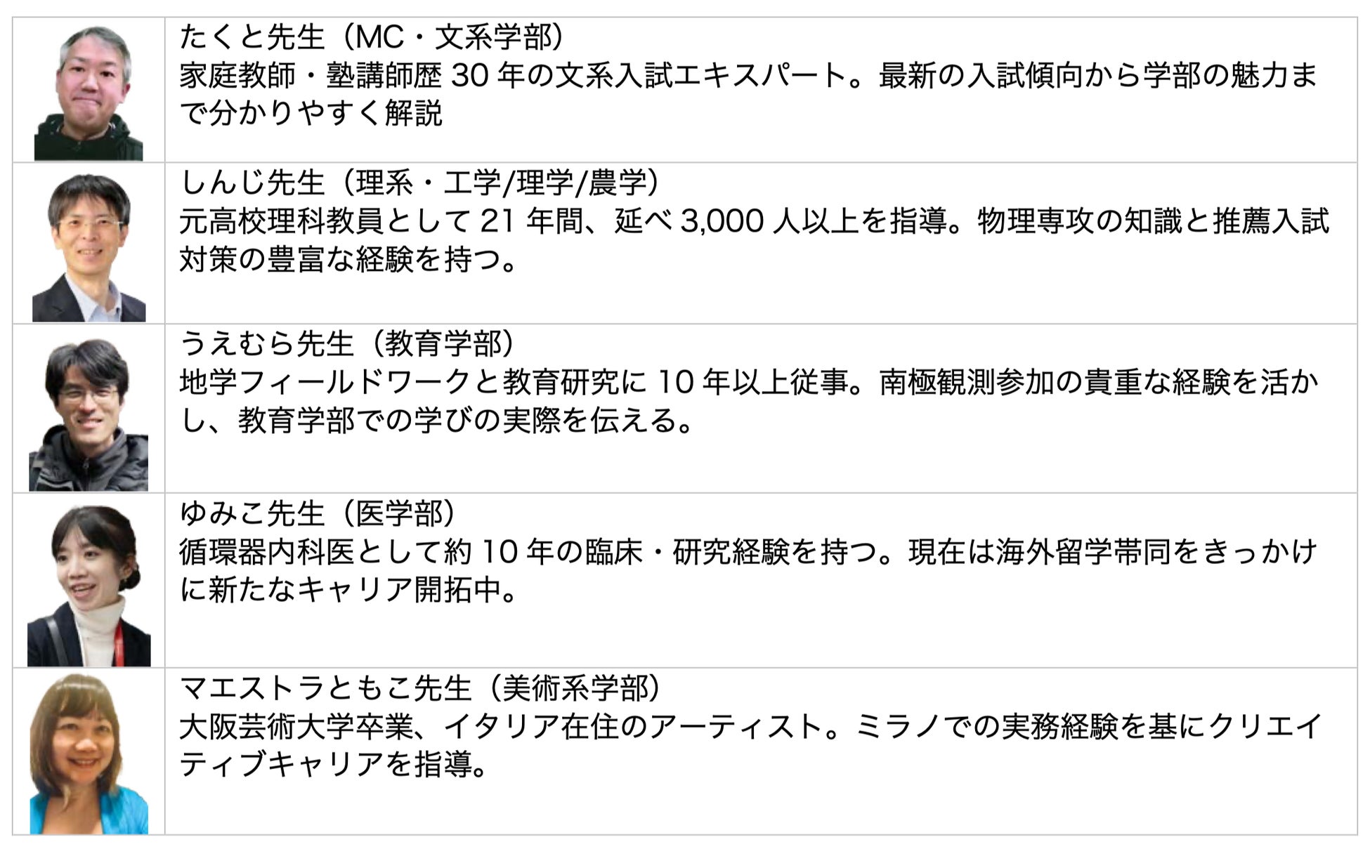 本イベントでは、理系・文系・医療・教育・芸術といった多様な分野のプロフェッショナル講師たちが、それぞれの「学部のリアル」や「進路選びで後悔しない考え方」を、親子で一緒にわかりやすく学べる90分のオンラインセッションをお届けします。