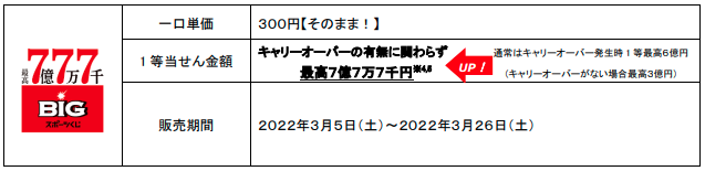 ※5 特別なBIGの前後の開催回は、通常のBIGとして、キャリーオーバー発生時1等最高6億円(キャリーオーバーがない場合最高3億円)となります。なお、当せん金は、売上金額や当せん口数によって変動します。