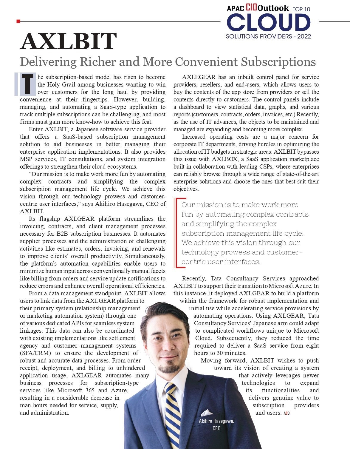 KDDI関連会社でサブスクリプション型ビジネス支援ソフトウェア「AXLGEAR」の開発・提供するAXLBIT株式会社(東京都港区/代表取締役社長:長谷川章博、以下AXLBIT)は2022年12月6日に米国ITビジネス誌『APAC CIO Outlook』が選定する「TOP CLOUD SOLUTIONS PROVIDER 2022」に選出されましたことをご報告いたします。
