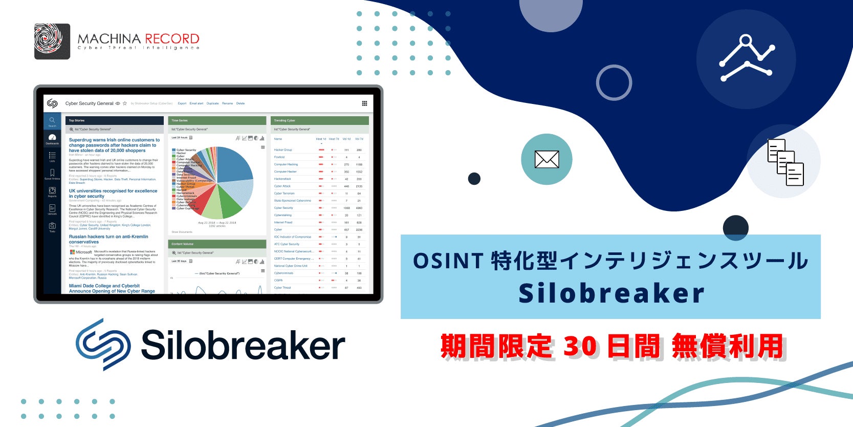 「サイバーインテリジェンス」を活用したセキュリティソリューションを提供する株式会社マキナレコード(本社:東京都港区、代表取締役:軍司祐介、以下マキナレコード)とパートナー企業のSilobreaker社(英、以下Silobreaker)は、2023年6月19日(月)〜2023年6月30日(金)の期間限定で、オープンソースインテリジェンス(OSINT)特化型インテリジェンス収集・分析ツールの無料トライアル第4弾を開始しました。