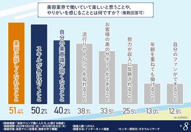 そこで、「美容業界で働いていて楽しいと思うことや、やりがいを感じることとは何ですか?(複数回答可)」と質問したところ、『美容に詳しくなれること(51.4%)』と回答した方が最も多く、次いで『スキルが身に付くこと(50.2%)』『自分の美意識が高くなること(40.2%)』と続きました。