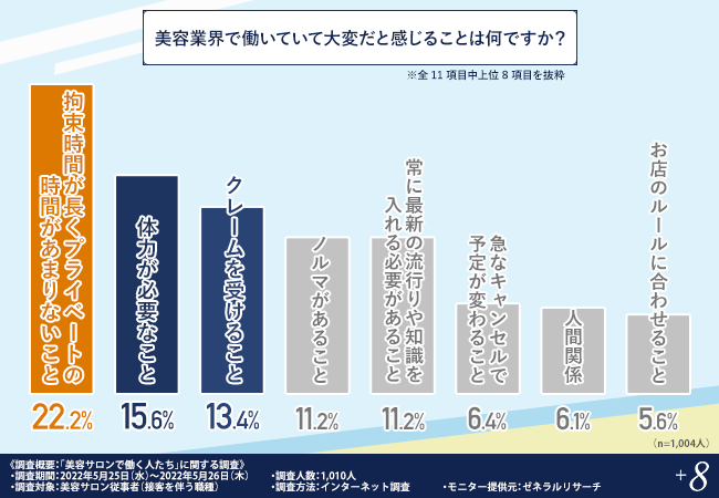 そこで、「美容業界で働いていて大変だと感じることは何ですか?」と質問したところ、『拘束時間が長くプライベートの時間があまりないこと(22.2%)』と回答した方が最も多く、次いで『体力が必要なこと(15.6%)』『クレームを受けること(13.4%)』と続きました。