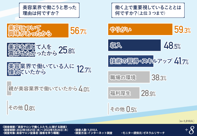 美容業界で働く上で、収入はもちろんのこと、やりがいを最も重要視している方が多く、美容に詳しくなれることや、お客様が笑顔になってくれることにやりがいや楽しさを感じているようです。