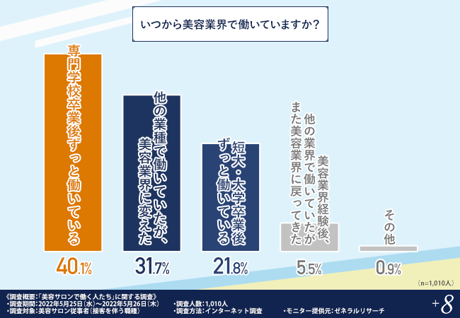 - 4割が専門学校卒業以降ずっと美容業界で働いている!