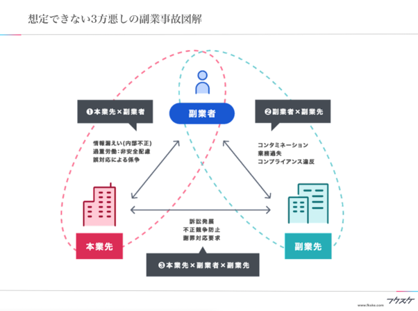 副業・兼業制度は新たな労働力の活用として政府も推奨する3方良しの取り組みですが、制度運用に関しては過重労働、法令遵守、情報漏えいなど、本業のビジネスリスク対策と同じく社会情勢に見合った一定のコンプライアンス知識が法人、個人双方に求められます。フクスケは、副業による事故を未然に防ぐクラウド型事故防止サービスを提供しています。従業員の副業・兼業の一般化で発生している最新の各種事故データを高度化した「インテリジェンス情報」を元に本業先、副業希望者、副業先3者間で発生する新種の事故を未然に防ぎます。