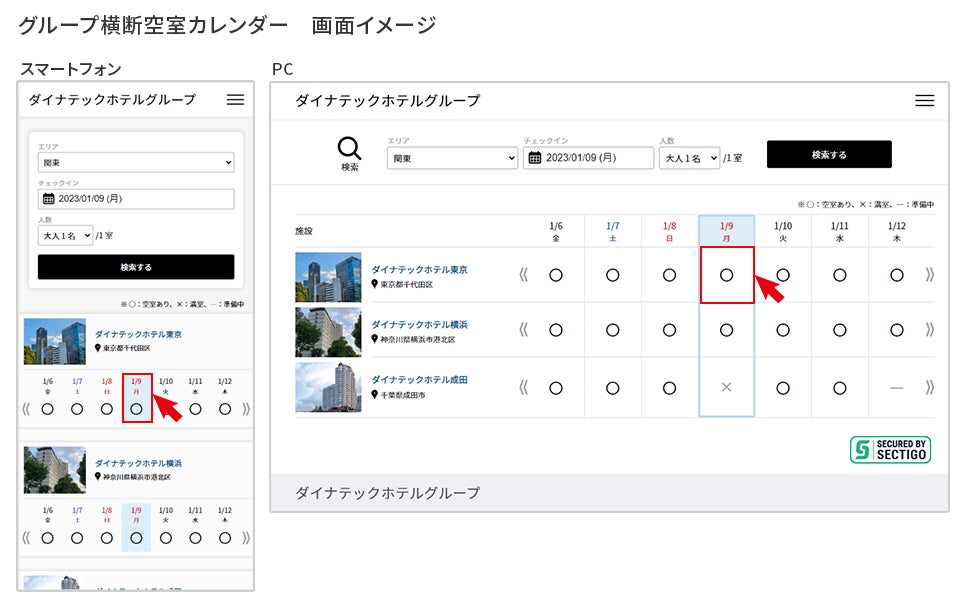 「グループ横断空室カレンダー」では、複数のグループ施設の空室状況(○×―)をカレンダー表示で比較できます。予約者様が、空室状況から日程を決めたり、決まっている日程から空いている施設を探し、カレンダーから直感的に空室を選ぶことが可能です。空室状況が分かりやすく、複数施設での比較検討がしやすいため、グループ内での予約の増加にも寄与します。