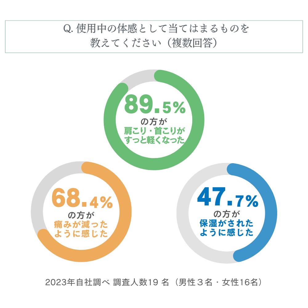 調査期間中、肩こり・首こりに限らず、対象者の68.8%が筋肉痛に、68.8%が足のむくみに、12.5%が保湿剤として全身や足裏マッサージ、手のこりなどに使用しました。