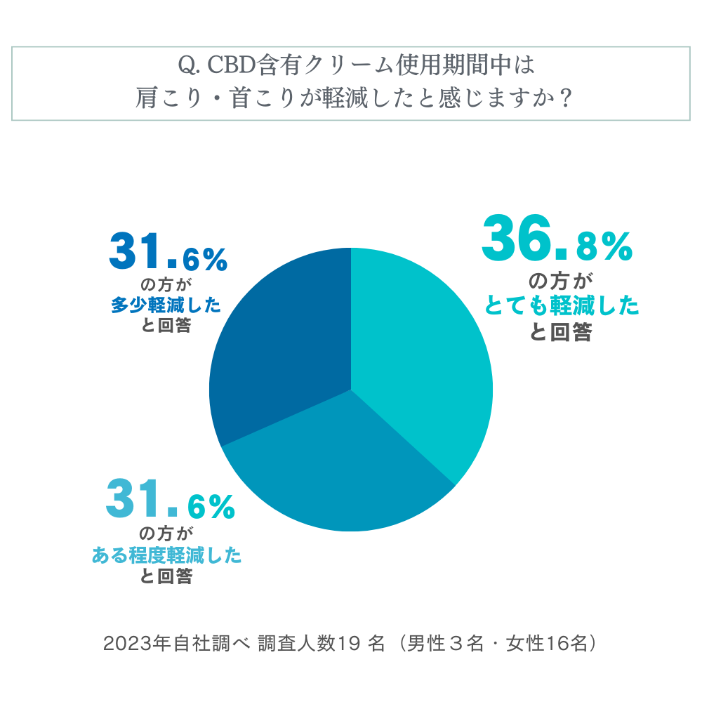 CBDクリームを使用した対象者全員が、「肩こりの緩和」に関して『とても軽減した』『ある程度軽減した』『多少軽減した』と回答しました。