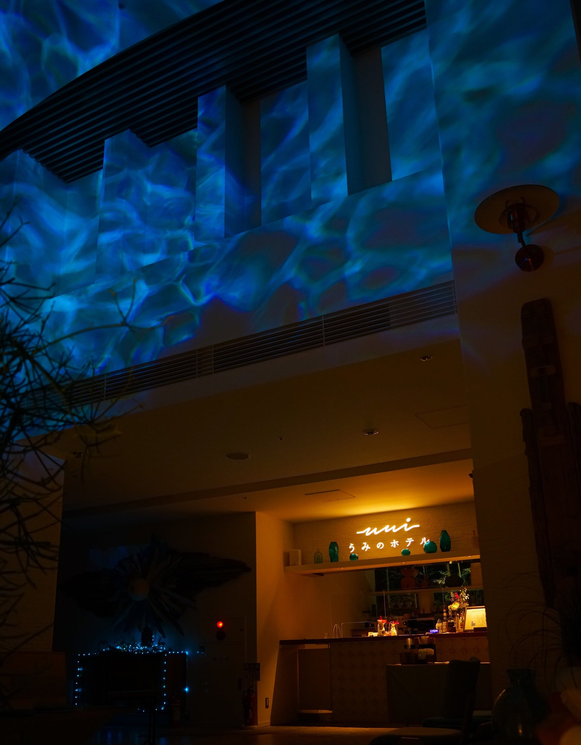 ウォーターゴボ(GOBO)と呼ばれるプロジェクターを使用し、キラキラと揺れる波の映像を壁に投影することで、幻想的な空間を演出します。
