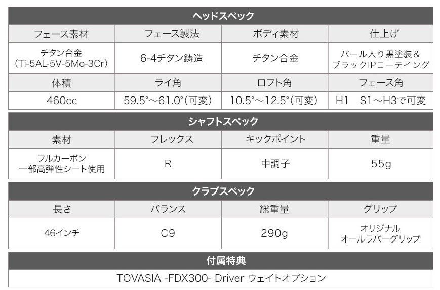 - TOVASIA ドライバー FDX300 スペック表はこちら