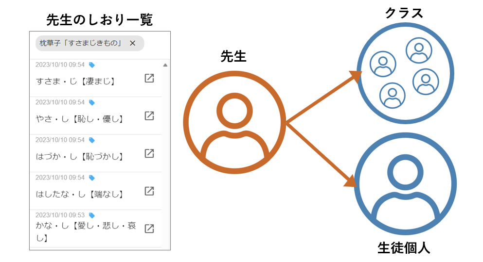 ・教員が登録したしおりタグ(語句一覧)を、生徒に配信。