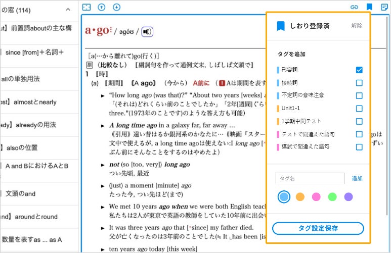 DONGRIでは、後から見直したい語句に「しおり」を登録できます。しおりには、分類するための「タグ」をあわせて登録できます。「間違えやすい語句」や「中間テスト」といったタグを用意することで、カテゴリー別にしおりを分類できます。