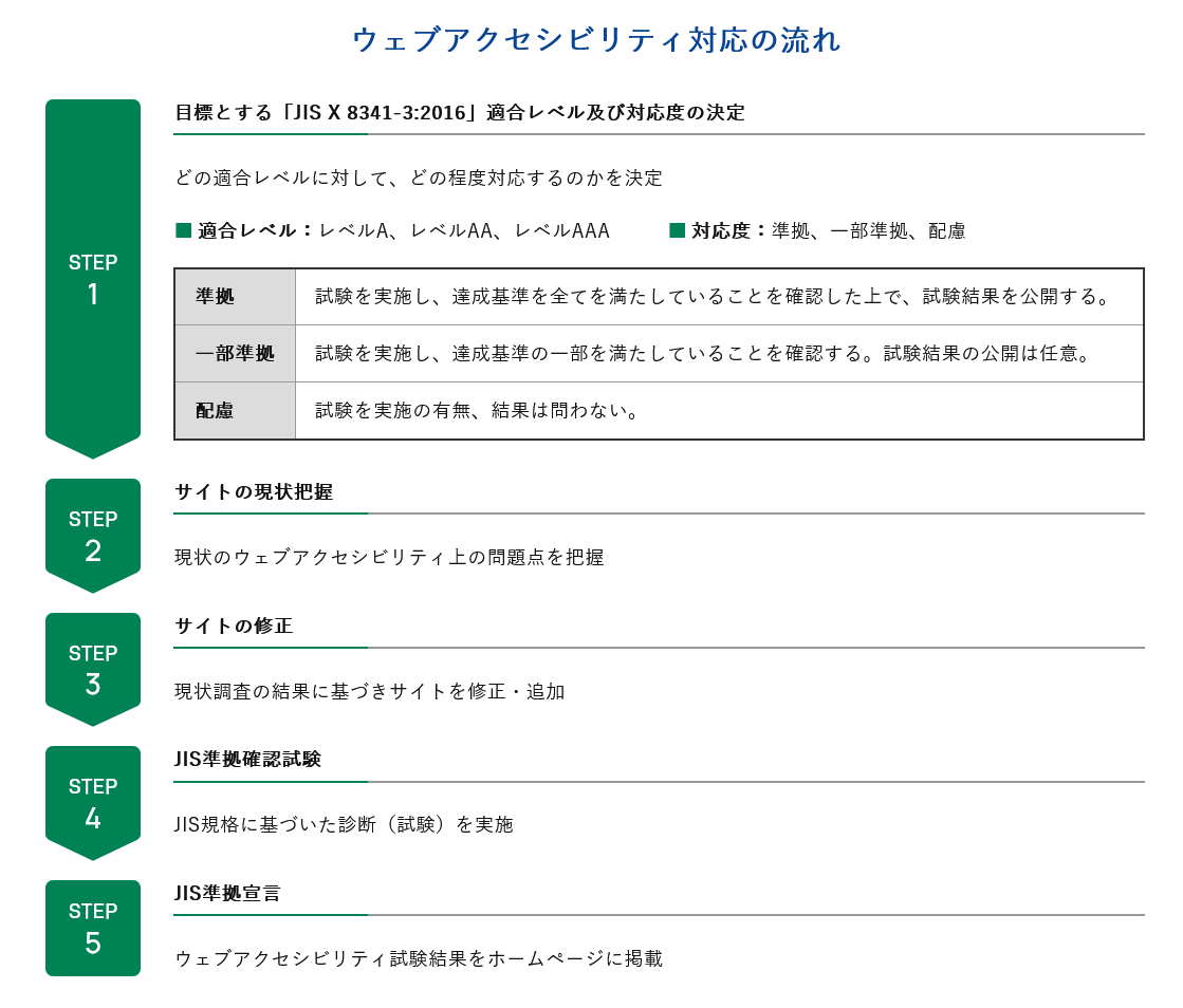 日本産業規格「JIS X 8341-3」に沿ったチェックリストに基づき、お客さまのウェブサイトのアクセシビリティ対応状況を診断。サイトの現状把握からウェブアクセシビリティ対応の方針策定支援、診断後のサイト改修など、ウェブアクセシビリティ向上を支援いたします。
