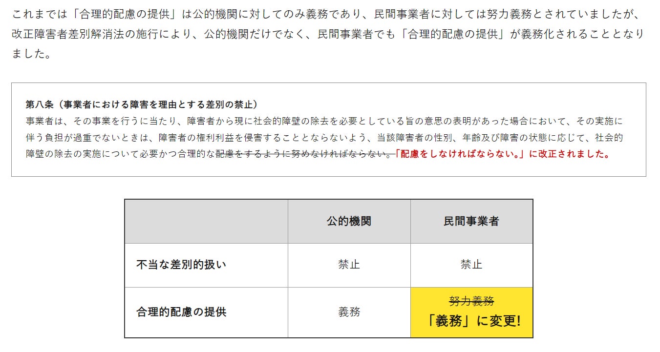 これまでは「合理的配慮の提供」は公的機関に対してのみ義務であり、民間事業者に対しては努力義務とされていましたが、改正障害者差別解消法の施行により、公的機関だけでなく、民間事業者でも「合理的配慮の提供」が義務化されることとなりました。