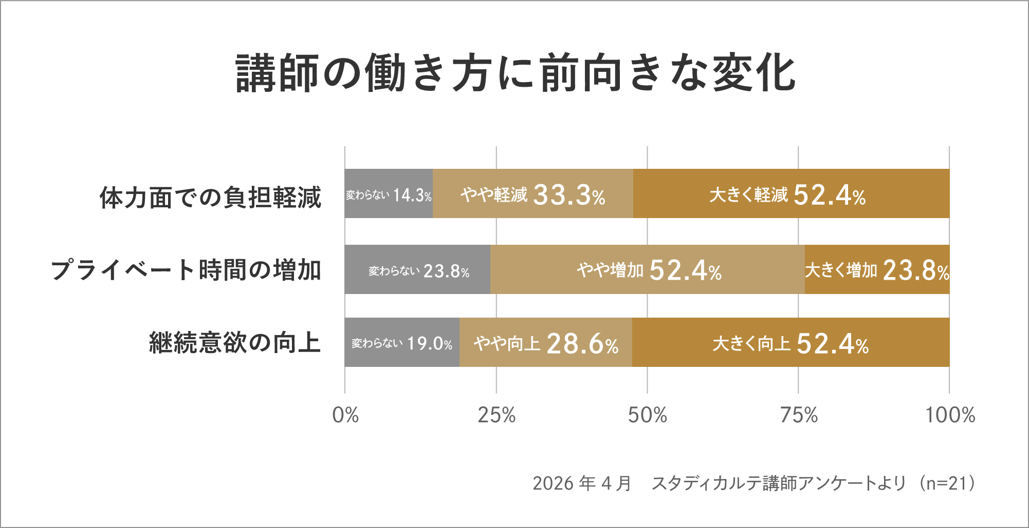 ✅ 76.2%の講師が「プライベートに充てる時間が増えた」と回答(「大きく増えた」23.8%、「やや増えた」52.4%)