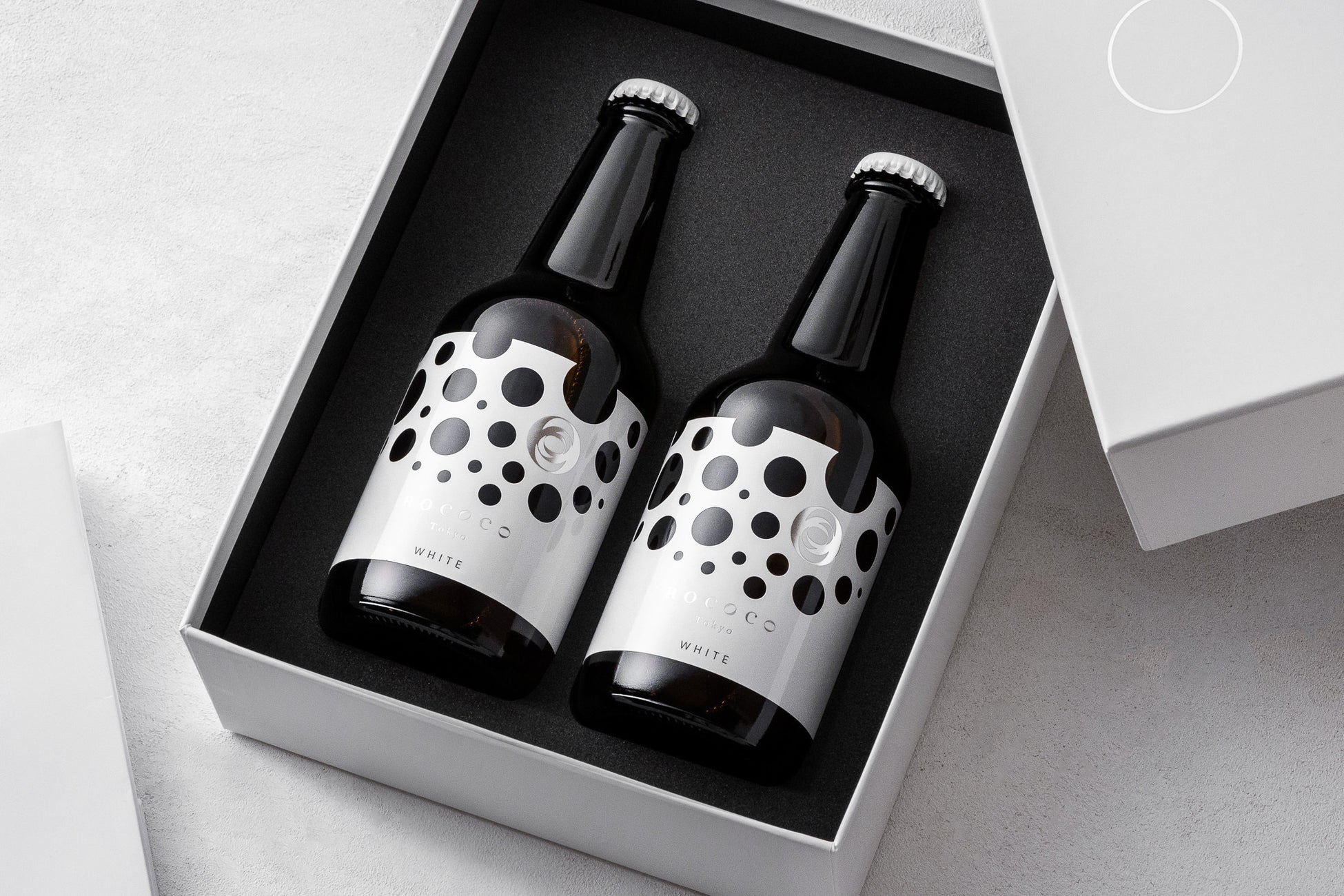 ギフトボックスは「ROCOCO Tokyo WHITE」 2本入りセットとなっています。従来のフォーマルな木箱タイプに加え、新たに登場したモダンでスタイリッシュな貼り箱タイプは白を基調としたシンプルなデザインで、真っ白な箱の天面にはROCOCOのシンボルでもあるサークルエレメントとロゴを、上下にはキャッチフレーズの「日本初のラグジュアリービール」がシルバーのホットスタンプで上品にあしらわれ、側面にはROCOCOのボトルが印刷されており、蓋を開ける前からその中に収まる姿を思い浮かべ期待感を膨らませます。