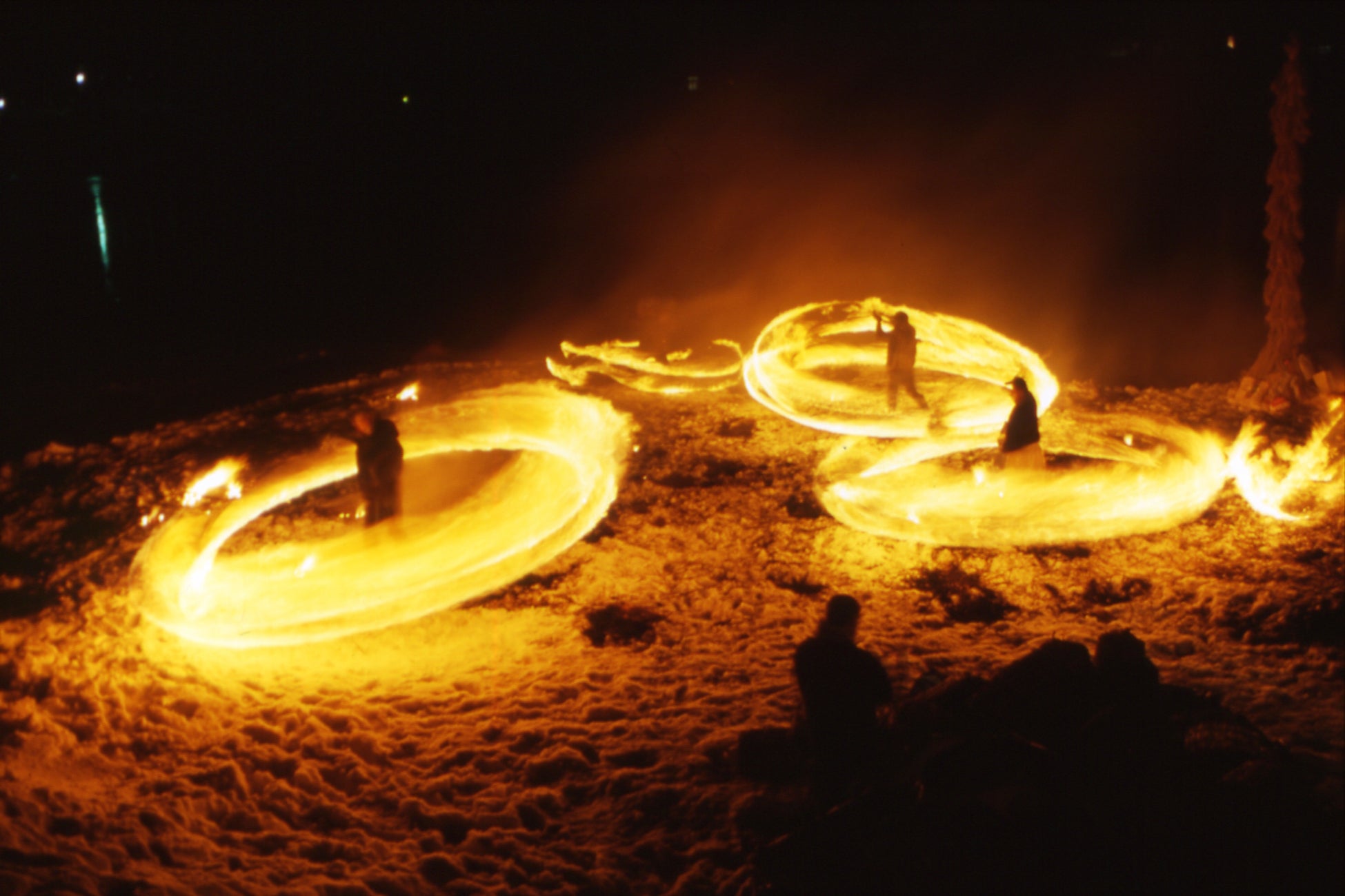 雪の中に華麗な火の輪が踊る幻想的で迫力のある祭りです。旧暦の小正月行事の一つで、神聖な火をつけた炭俵を自分の体のまわりで振り回して家族の無病息災・家内安全など、一年の無事を祈願します。