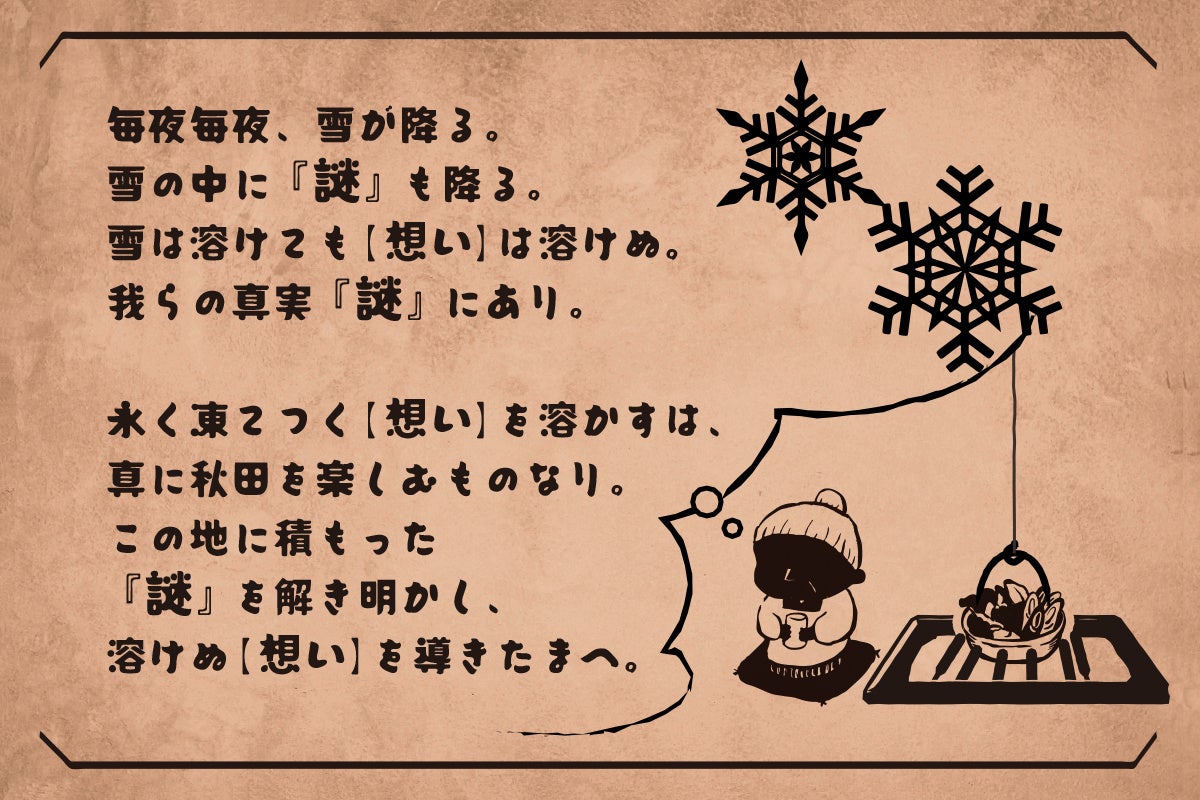 冬の秋田は寒いけど、ちょっと不思議でどこか温かい。そんな謎解き体験ミステリーです。