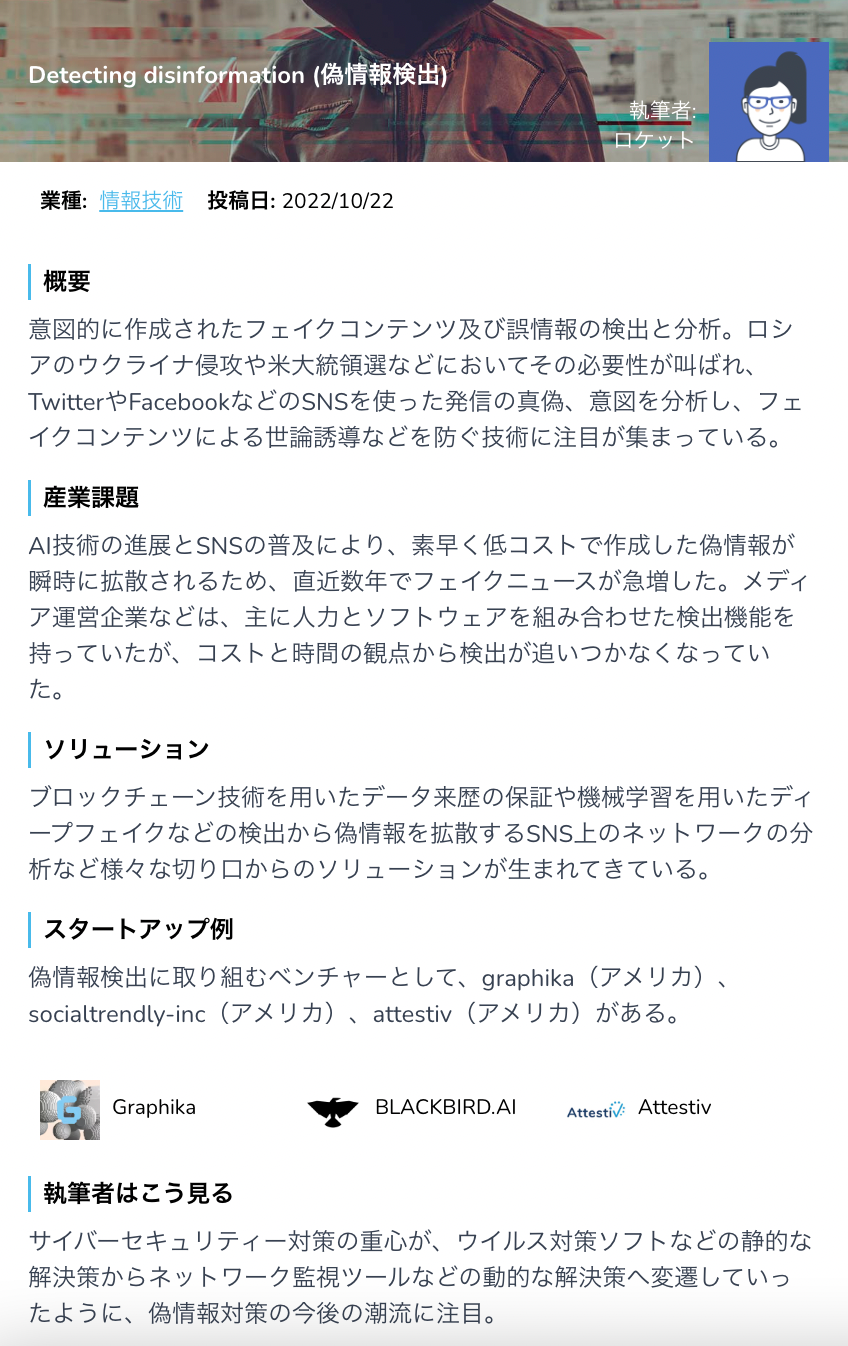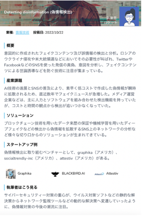 事業内容 :世界のスタートアップ関連の情報提供、新規事業開発に関する各種業務支援サービスの提供