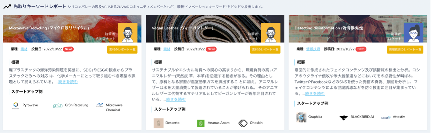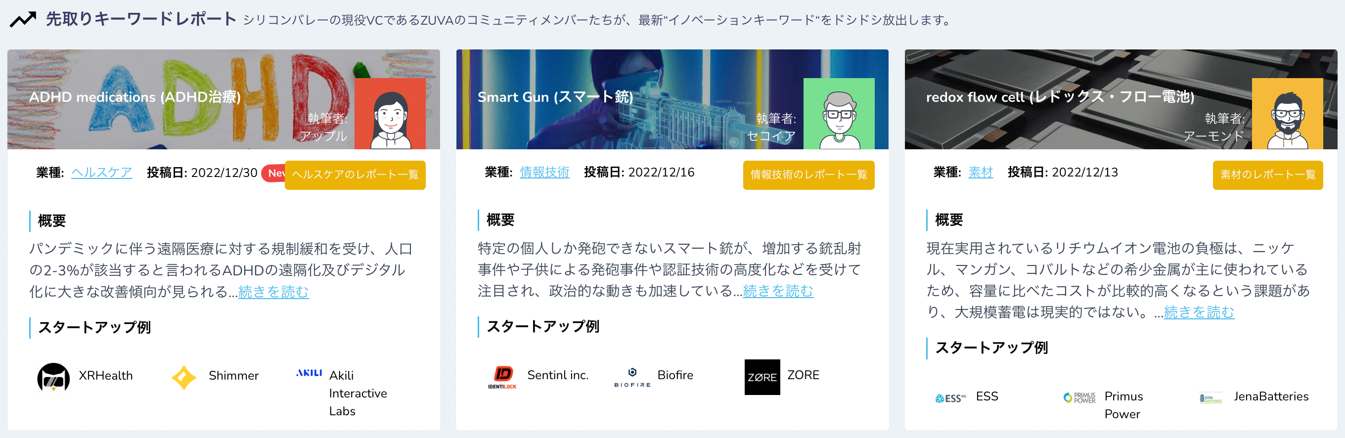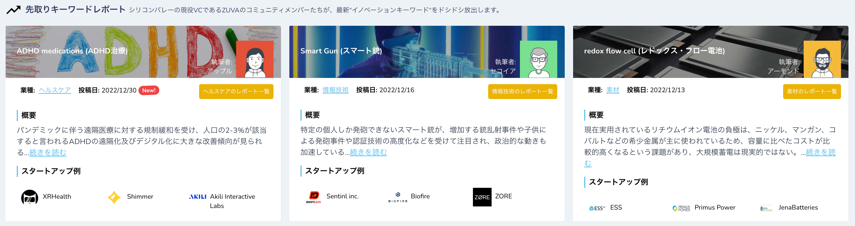 世界のスタートアップ関連の情報提供、新規事業開発に支援サービスを提供するZuva株式会社(東京都新宿区 代表:菊池 慶輔 読み:ズウバ)は、事業会社向けスタートアップDBの新コンテンツとして、シリコンバレーの現役ベンチャーキャピタリストたちが、今後一大トレンドになる可能性のある最新の「イノベーションキーワード」を解説するコラム「先取りキーワードレポート」の提供をサービスサイト内(https://zuva.io/)で1月9日より開始します。