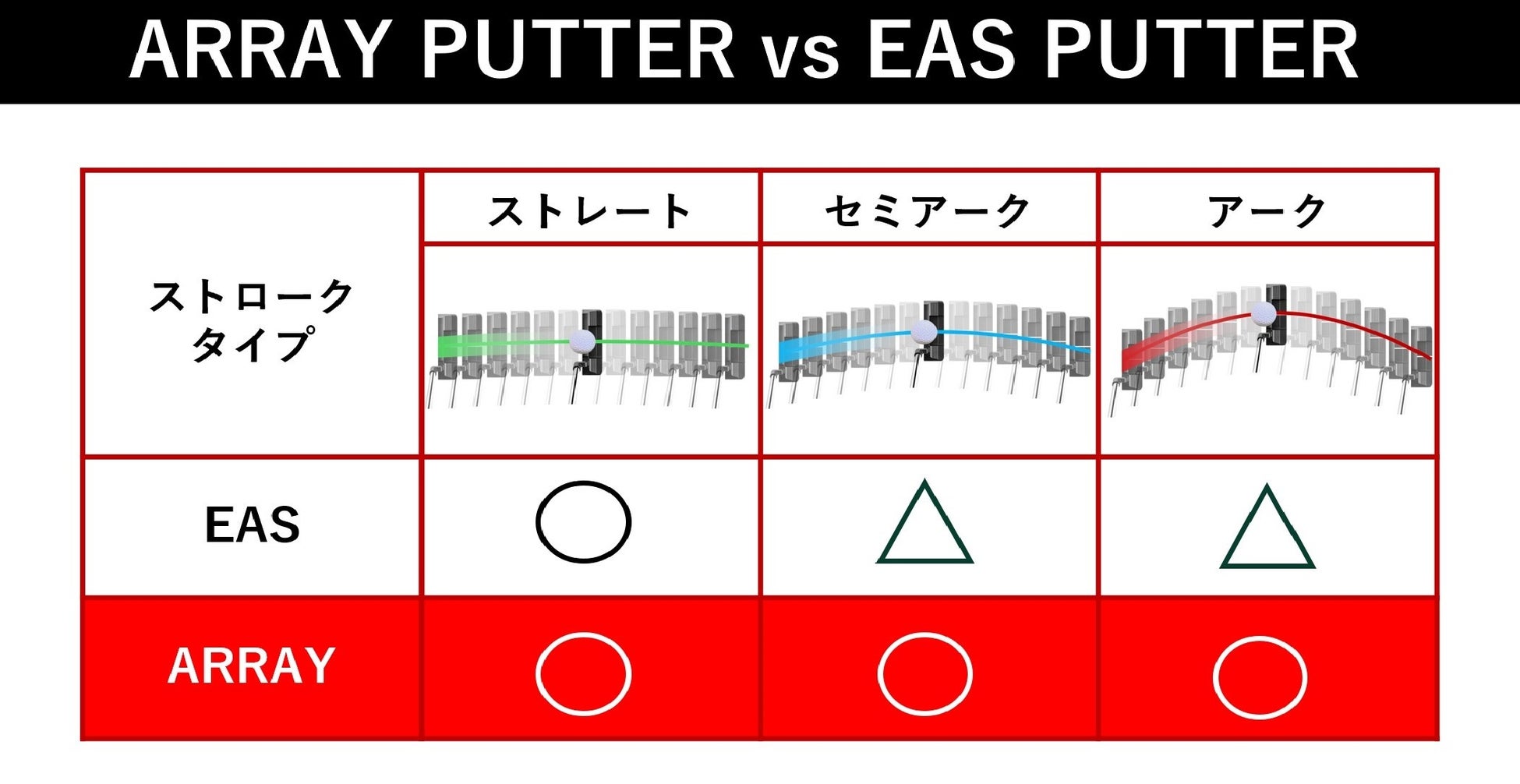また市場ニーズもほとんどが「セミアークタイプ」や「アークタイプ」になっており、顧客ニーズを満たしておらず販売面でも苦戦を強いられていました。この課題を解決したのが「ARRAY PUTTER」になります。