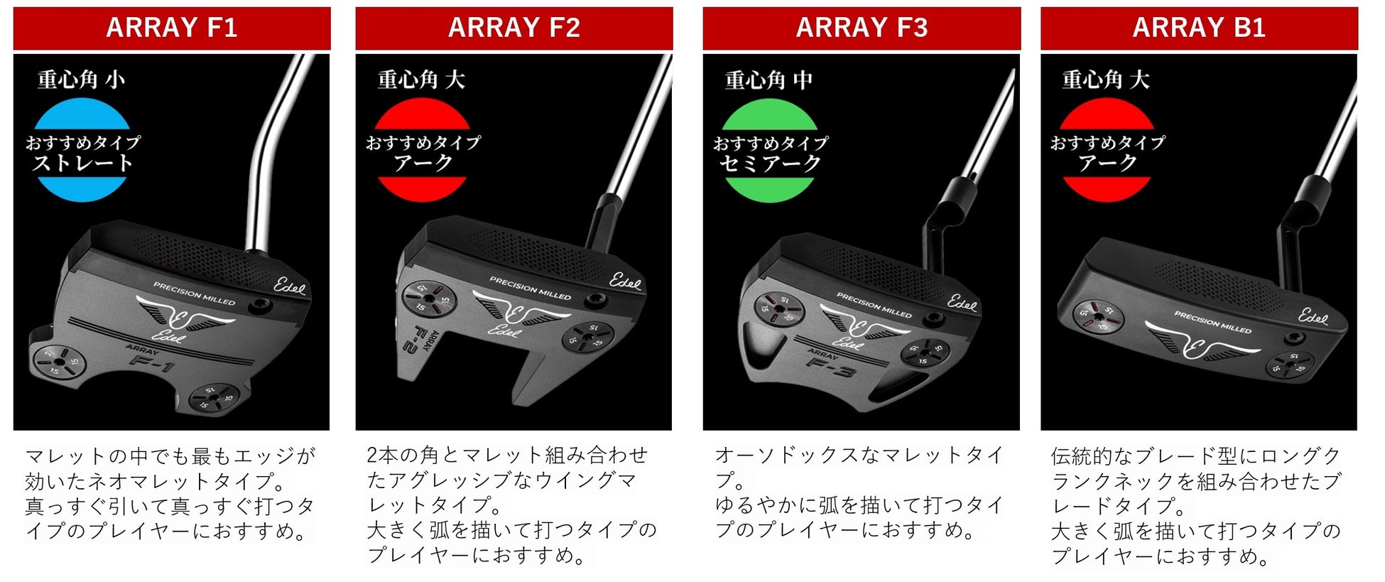 「ARRAY PUTTER(アレイパター)」は新しいユーザーに向けて開発された新シリーズです。従来のトルクバランスに加えて重心角に注目し、フェースバランス・トゥヒールバランス・トゥバランスをラインナップに追加しました。ひとりひとり異なるストロークタイプに合わせて重心角をコントロールすることでより多くの人が打ちたい距離感、ターゲットにスムーズかつ正確に打てるようになります。この「ARRAY PUTTER(アレイパター)」によって前作の「EAS PUTTER(イーエーエスパター)」が適していた真っすぐ引いて真っすぐストロークするプレイヤー以外にも選択肢を提供できるようになり、Edelのブランドコンセンプトである”ひとりひとりの個性に合わせたクラブの提供”により1歩近づきました。