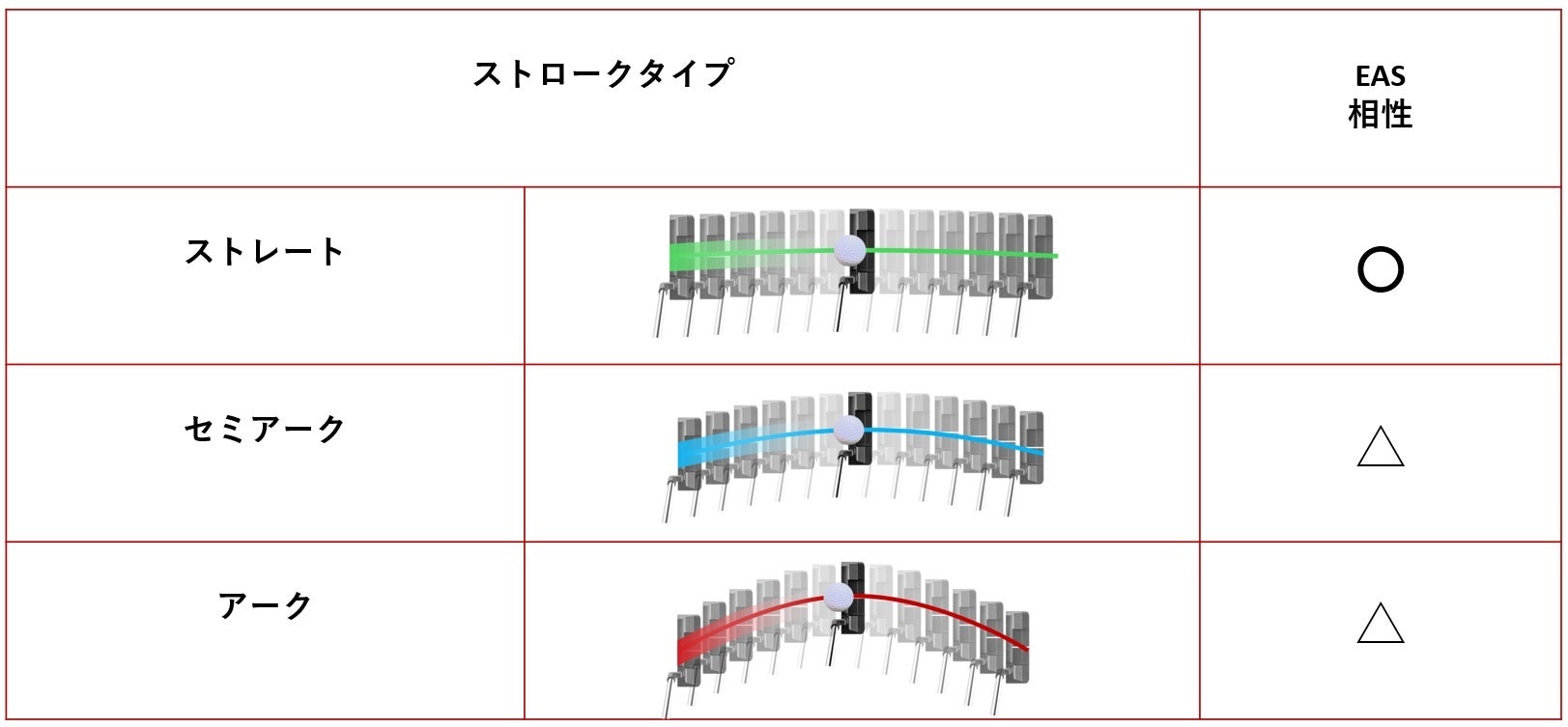 パターのストロークタイプは大まかに3つのタイプに分けられますが、Edel Golfが提供していたEAS PUTTERでは真っすぐ引いて真っすぐストロークする「ストレートタイプ」のプレイヤーにしか適切なパターの提供ができていませんでした。